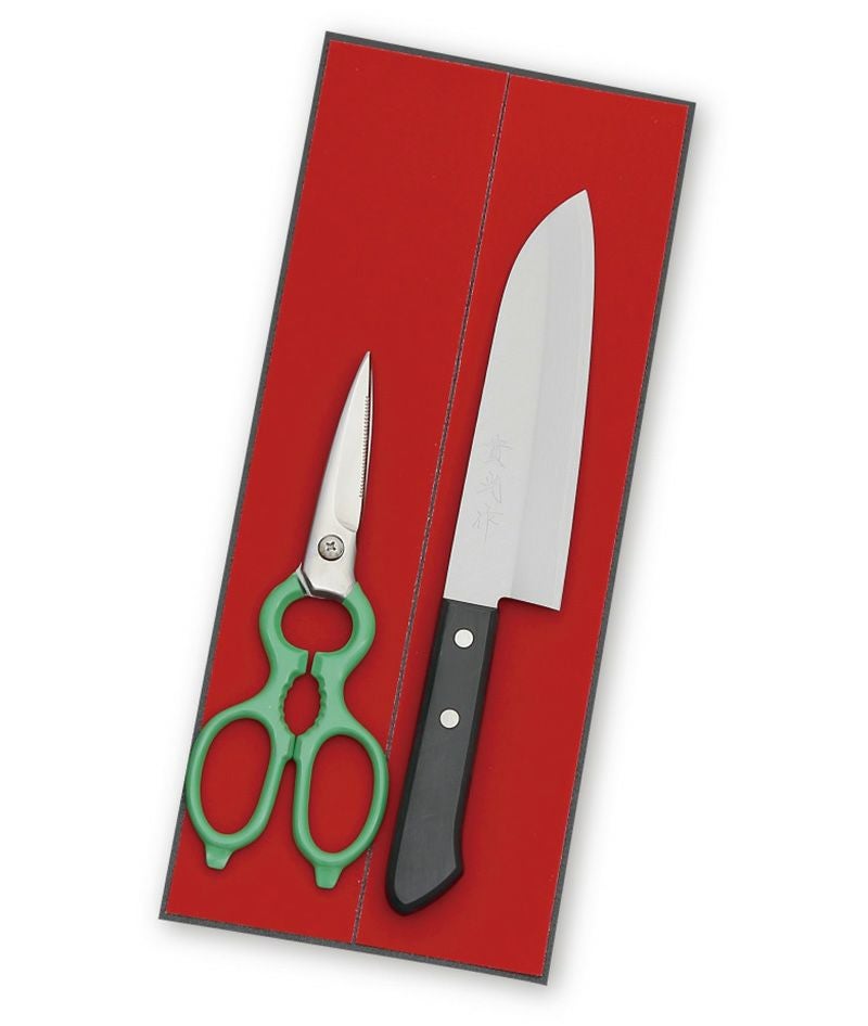 | 材質 | ●三徳包丁 刃身:日本鋼,柄部:合板柄 ●キッチンバサミ:ステンレス |