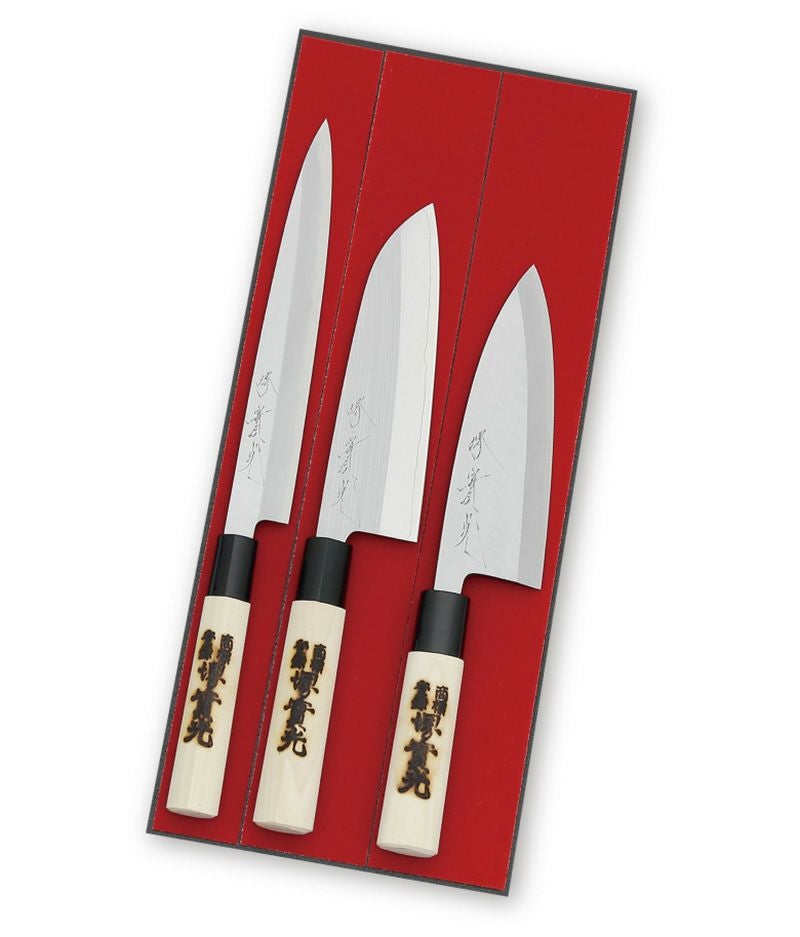 | 材質 | ●三徳包丁 刃身:ハイス鋼(両刃), 柄部:PC口輪柄 ●出刃包丁 刃身:日本鋼(片刃), 柄部:PC口輪柄 ●刺身包丁 刃身:日本鋼(両刃), 柄部:PC口輪柄 |