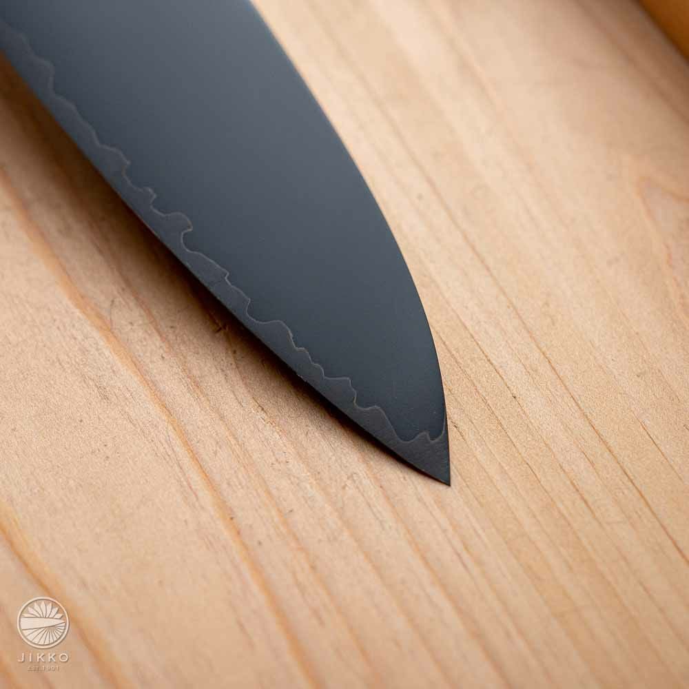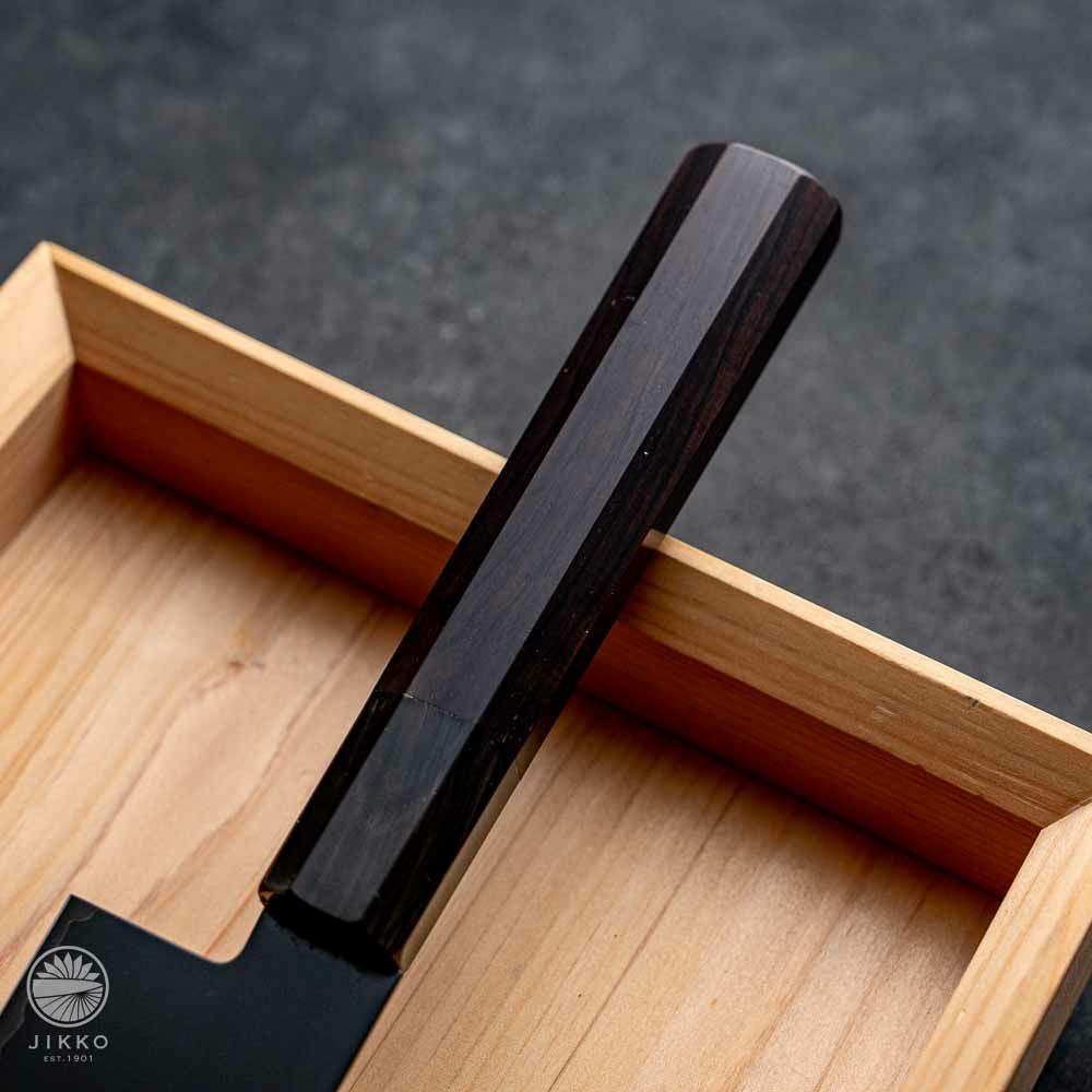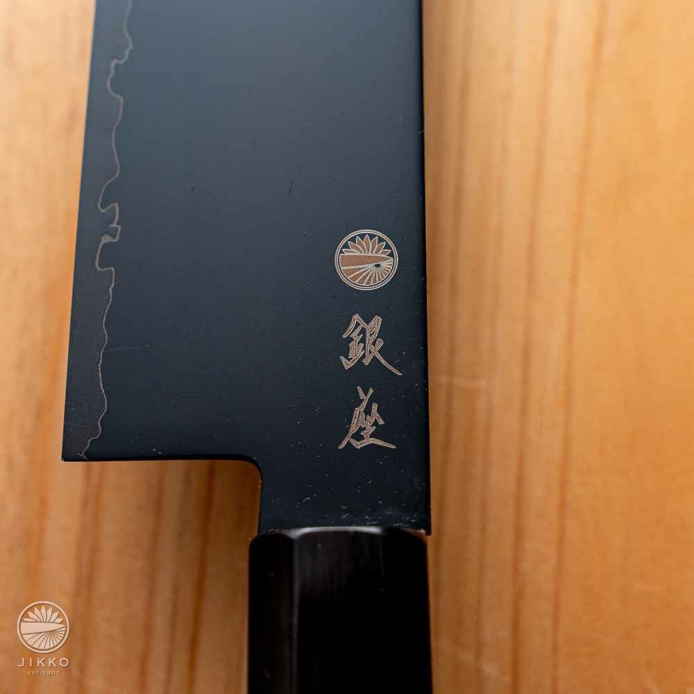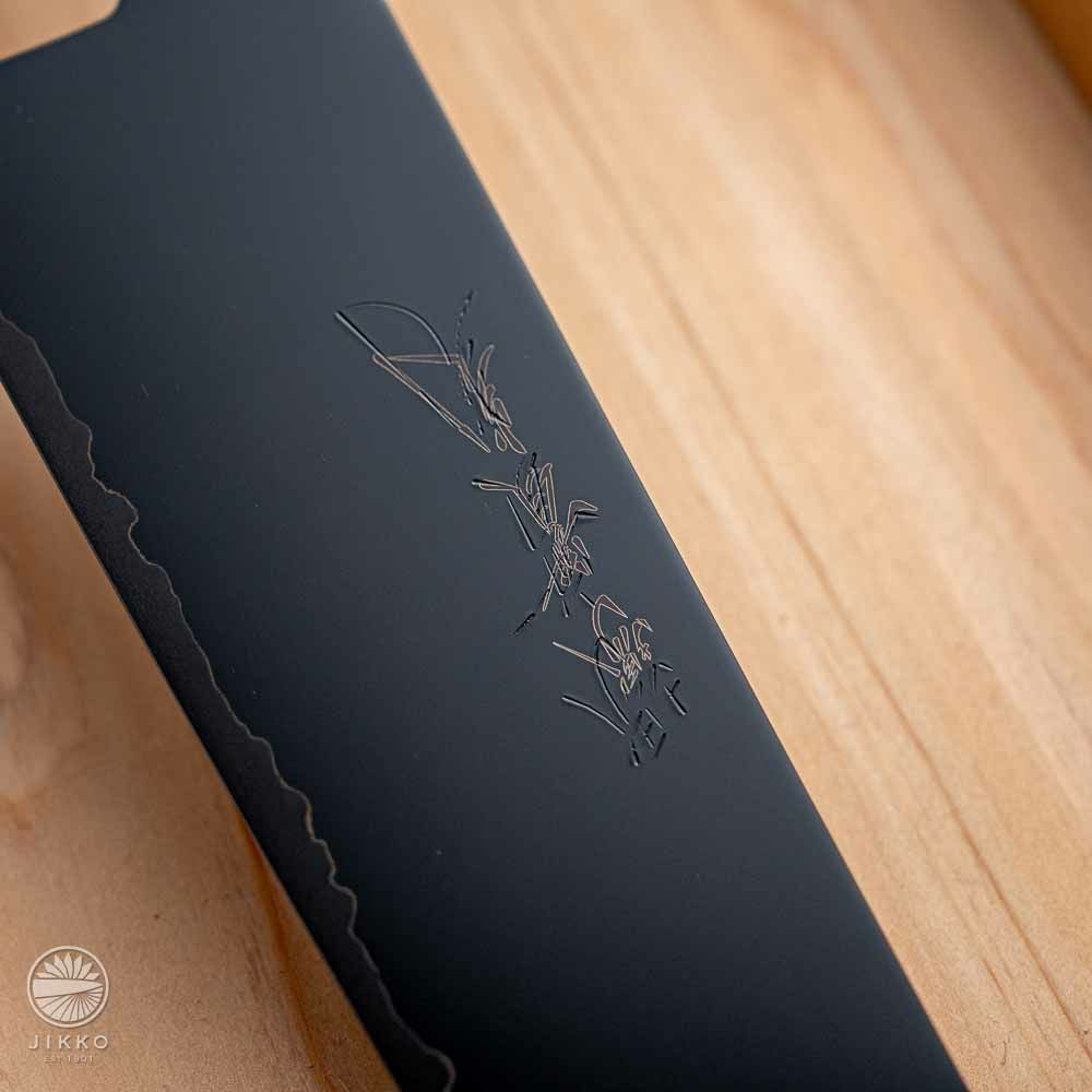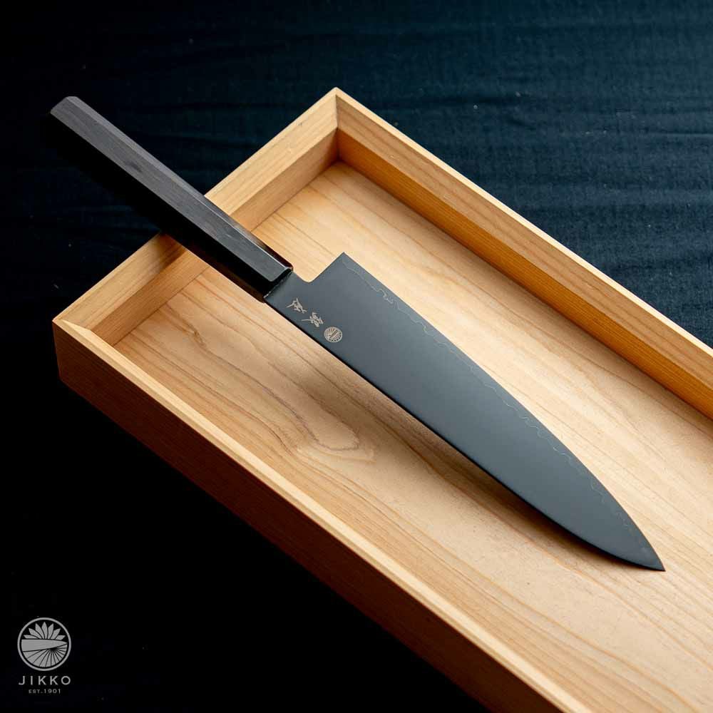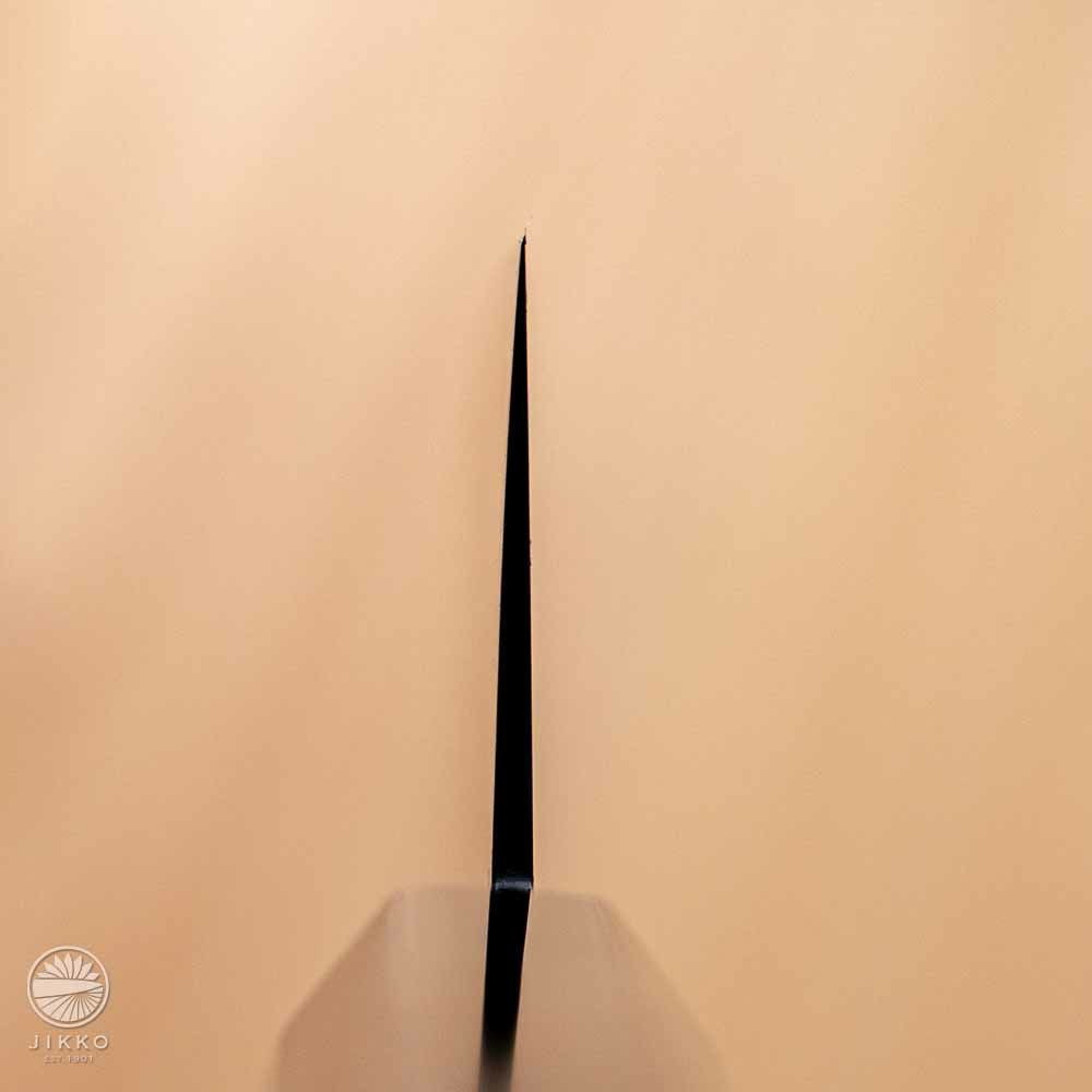 銀座のお寿司屋さんから他にない包丁を作ってほしいと依頼を受けて出来た包丁です。見た目は刃と柄を黒で統一した包丁で、目を引くデザインです。対面カウンターなどお客様から見える場所で調理をする方にお勧めです。