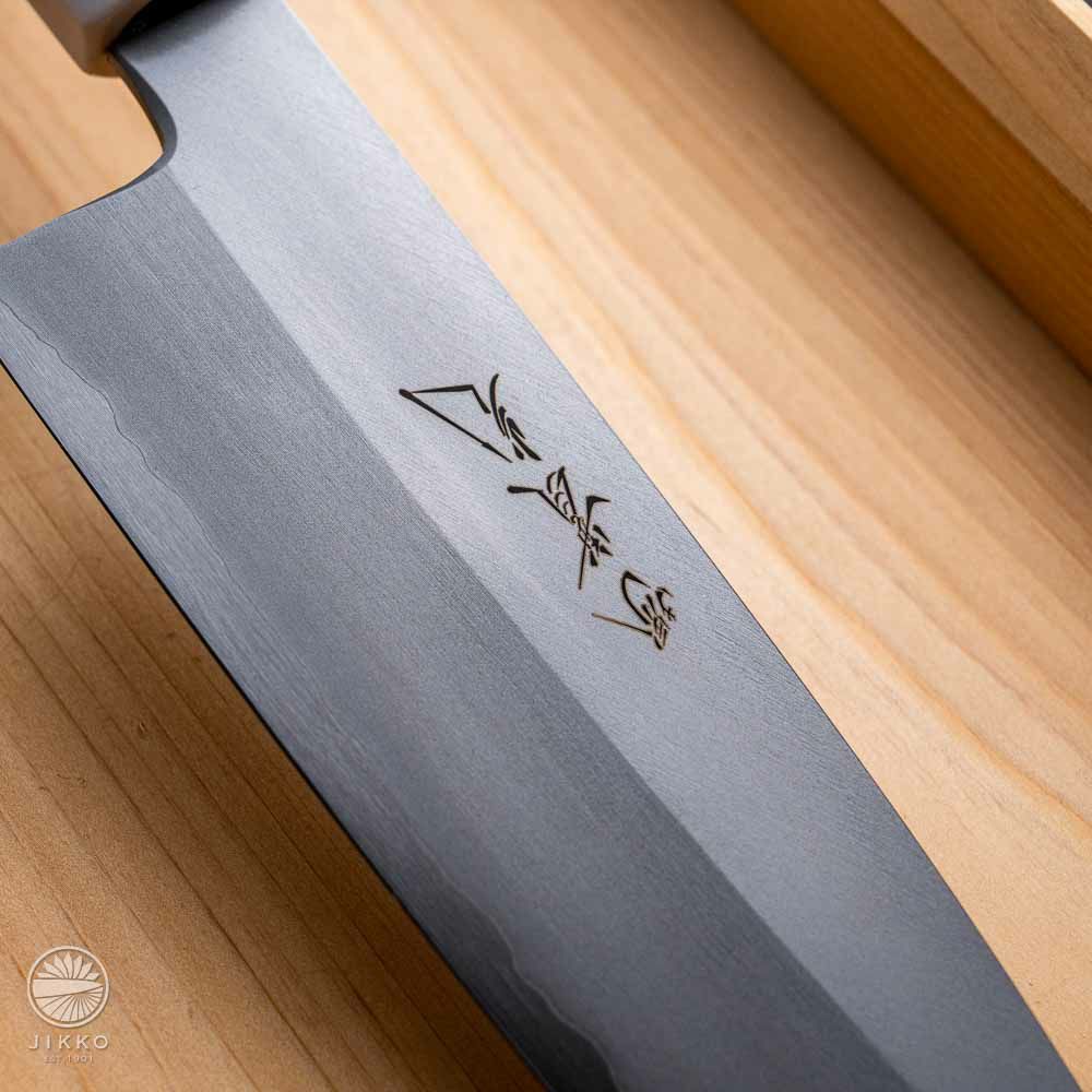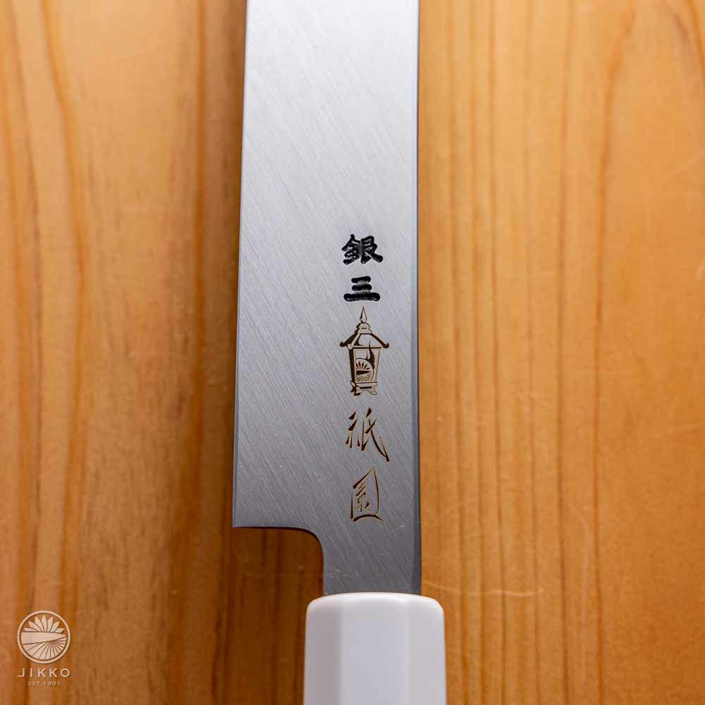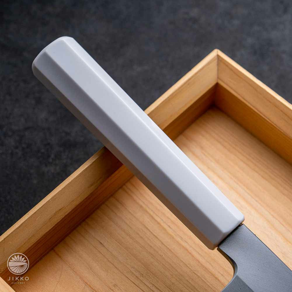 祇園の料理人からのご依頼で新しい包丁を造ってほしいと依頼があり出来た祗園シリーズ。刃とハンドルも全体的に白くデザインしています。
