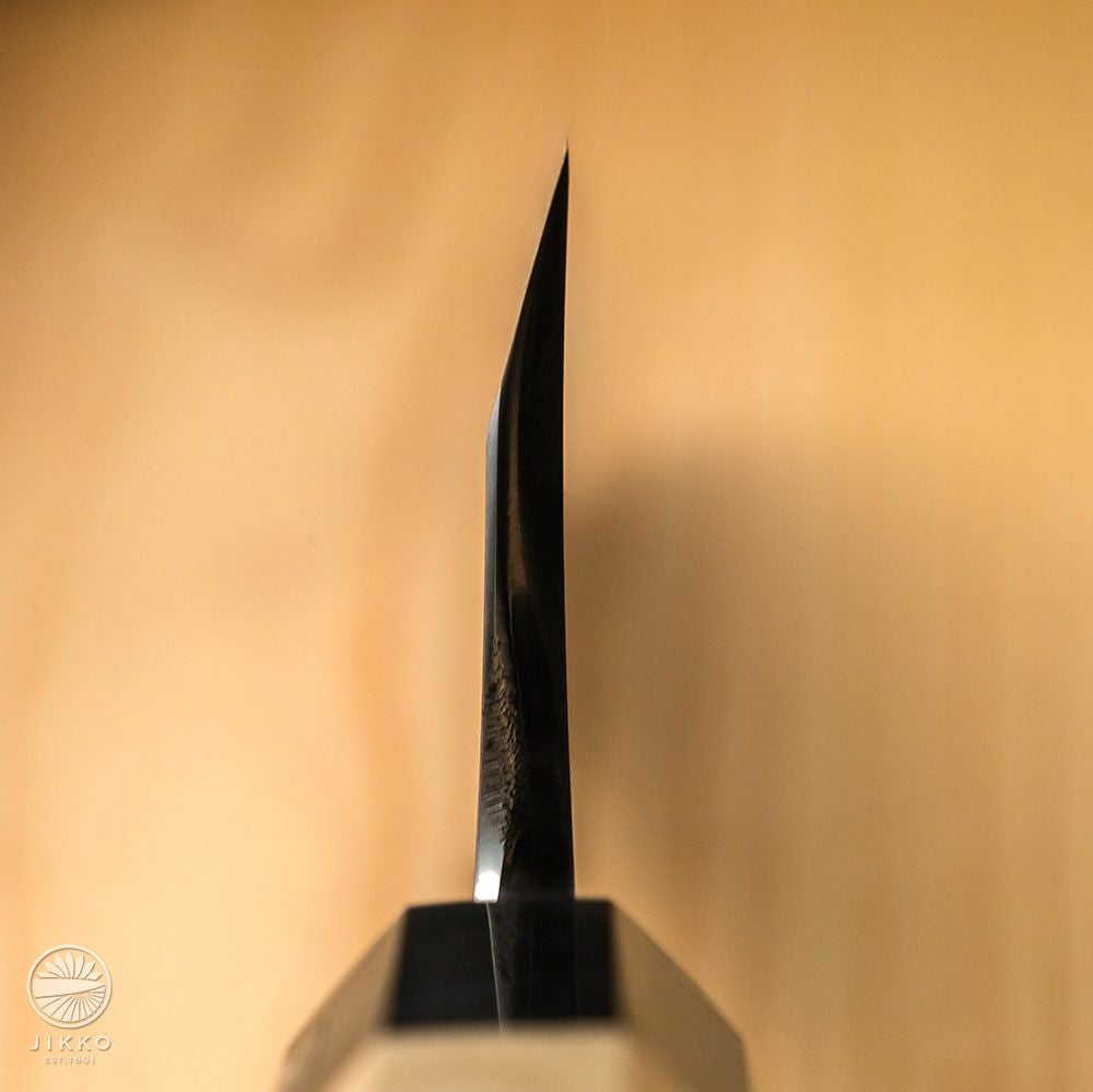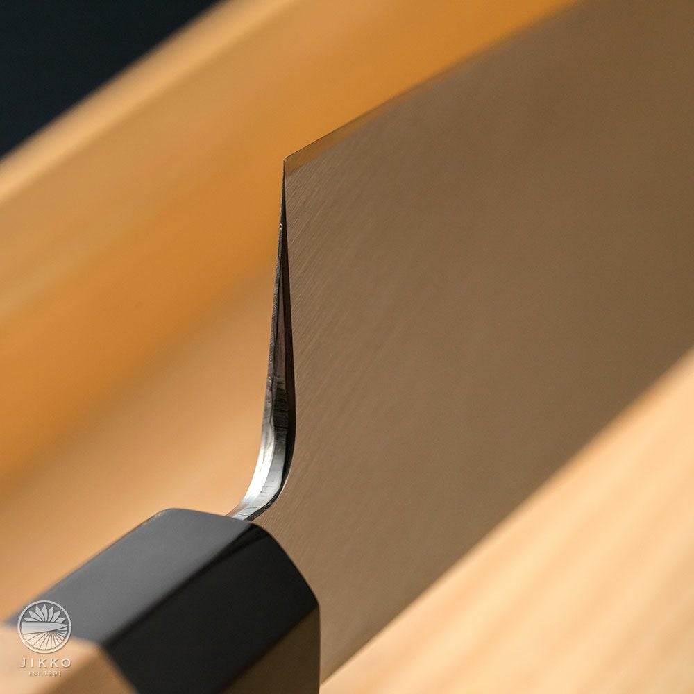 本焼包丁は単一の鋼材から作られます。非常に硬度が高いことから、切れ味とその持続性が大変優れている包丁です。しかし、その硬さゆえに、製造には繊細なスキルが求められ、熟練の鍛治師や研ぎ師でも一本を仕上げるのに多くの労力がかかります。