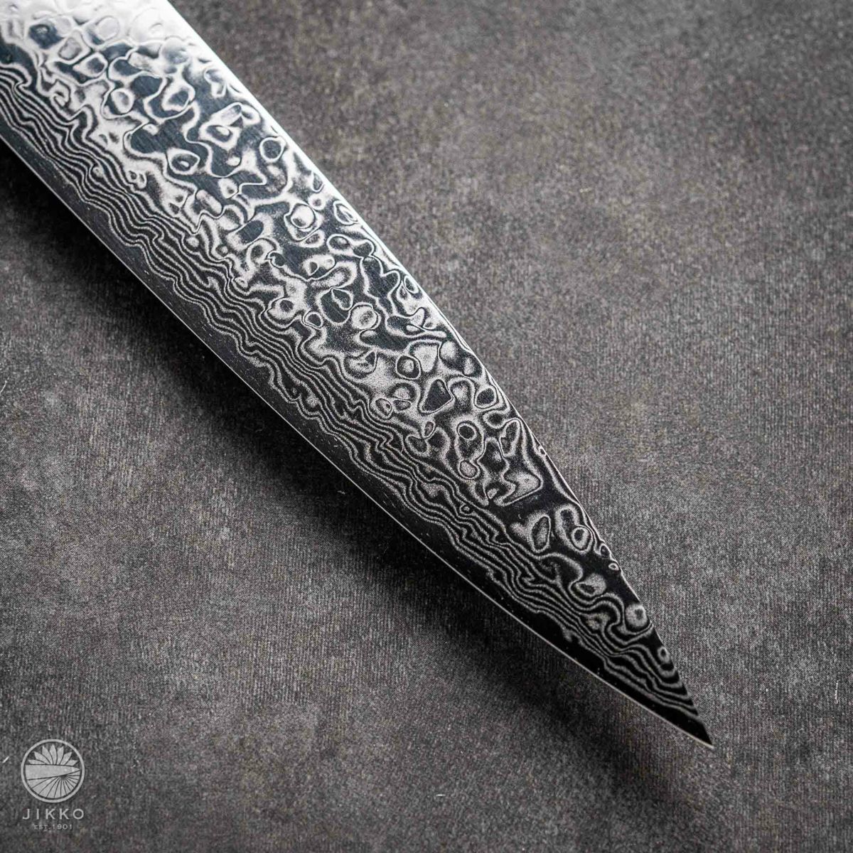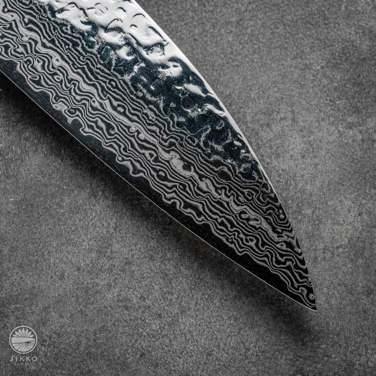 大きく分けると表面を磨いたタイプの「ロコ」と表面が凸凹した槌目模様の「ボコ」があります。材質は「SG2」と「VG10」がございます。最後に、模様の違いで「ダマスカス模様」か「3層タイプ(模様無し)」になります。