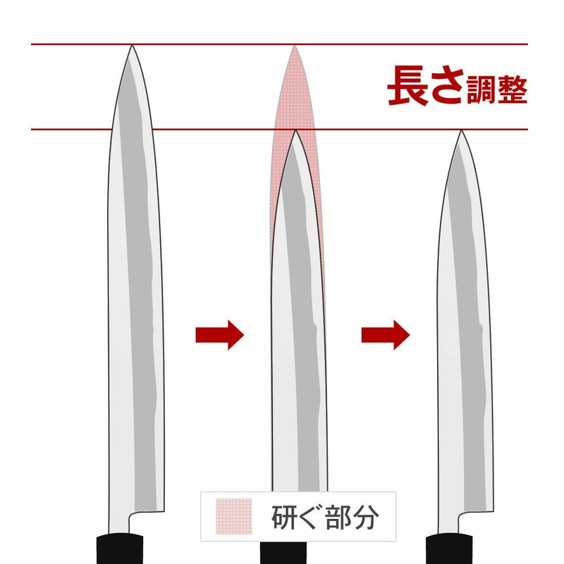 | 仕様 | 包丁の長さを短くするサービスです。ご希望のサイズを言っていただくか、マジックで希望のサイズを書いて送って頂くとそのサイズにカットします。 |