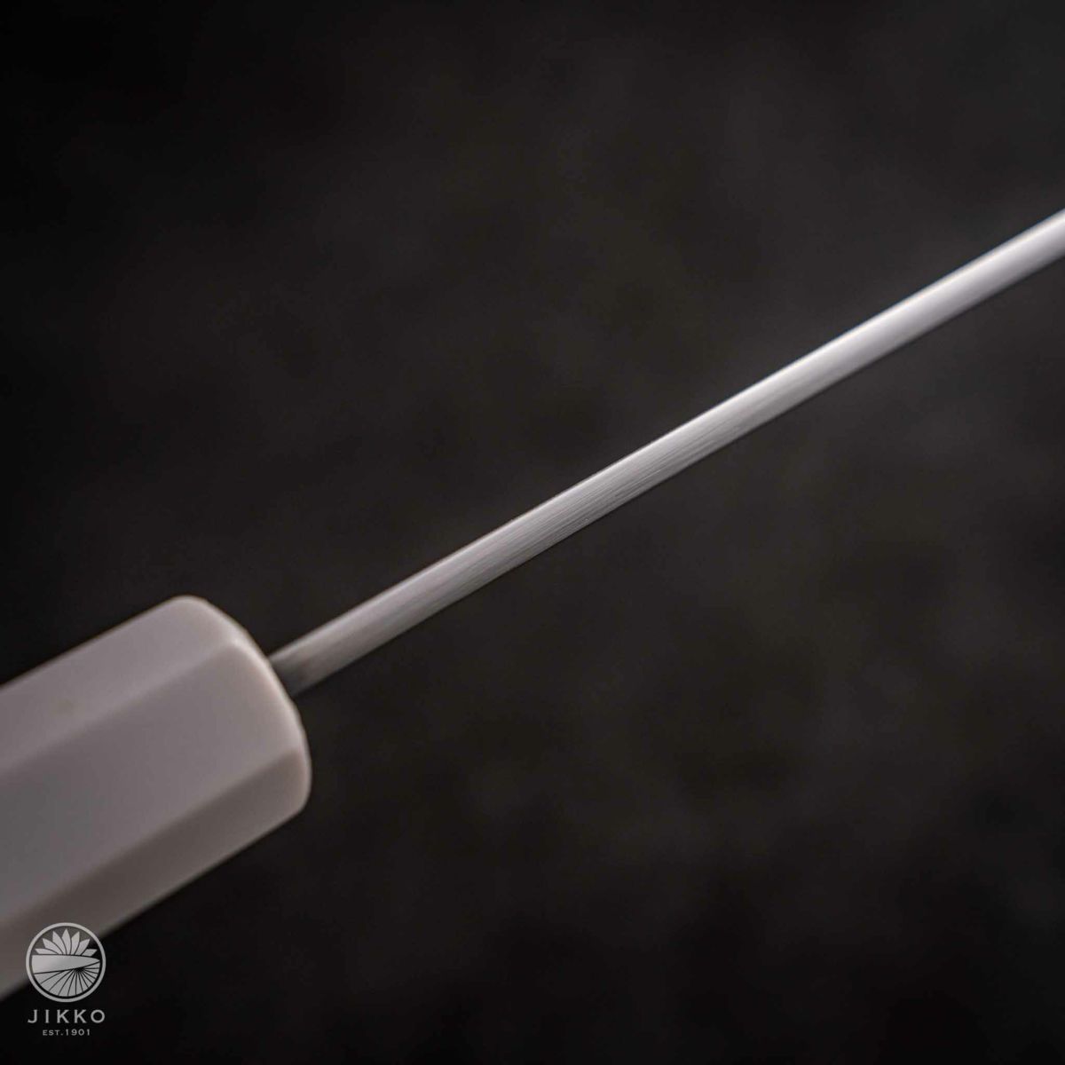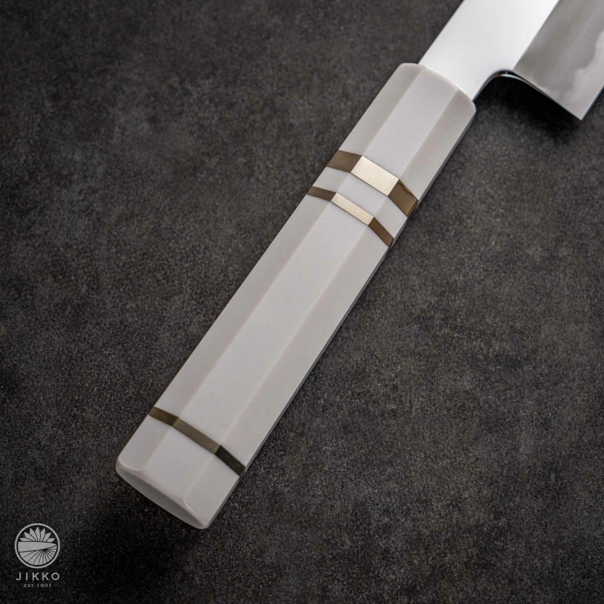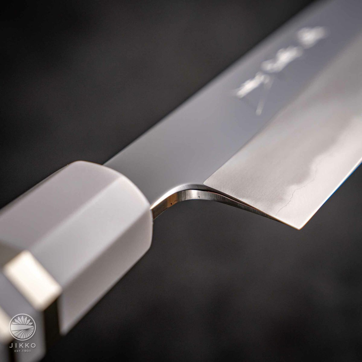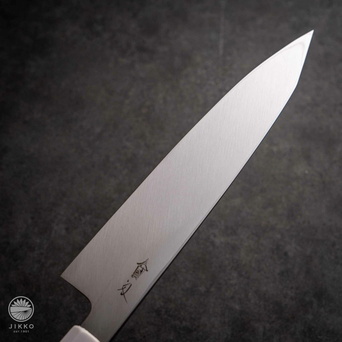 他の画像を見る 【祇園 白鋼】 片刃 切付牛刀 白紙2号 当店価格 ¥ 56,980 税込 +詳しく見る 白を基調としたデザインになります。清潔感のあるイメージです。切れ味と研ぎやすさを兼ね備えた白紙2号で製造しているので料理人にお勧めです。 詳細を見る お気に入りに登録する