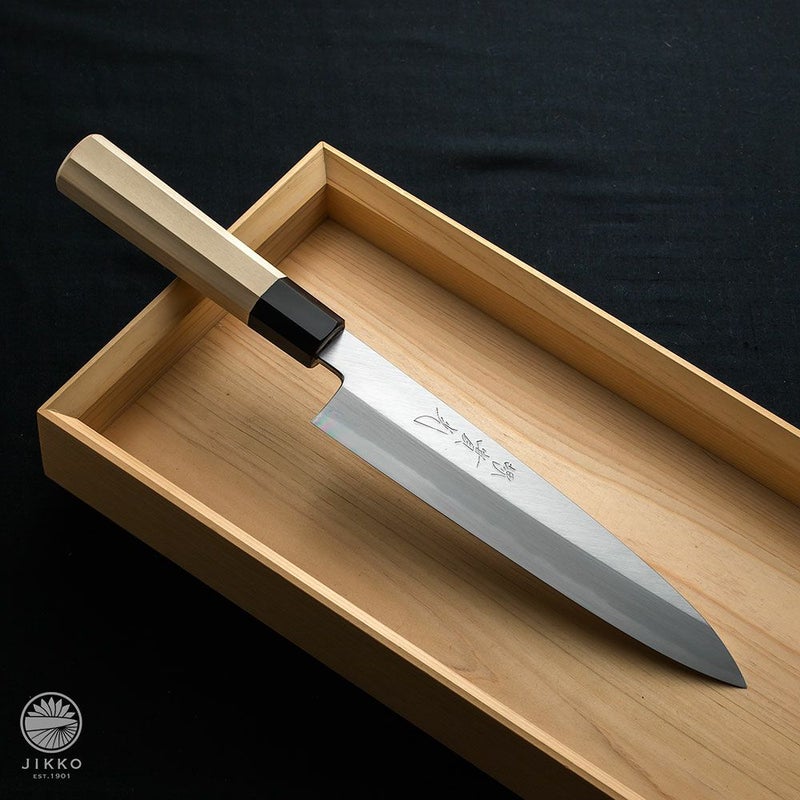 【arata 白】片刃 牛刀 レビュー 寿司屋の仕込みは、営業前の短時間勝負。 鯵、サバ、ノドグロ、タイ、イカ、エビ、マグロ…と一気に捌くため、 包丁をいちいち替える余裕はない。 今回購入した21センチの片刃牛刀は、正直少し大きすぎた。 身幅もあり、スピード重視の現場では出番が少ない。 18センチの片刃三徳か、15センチの鯵切りのほうが手になじむ。 切れ味自体は申し分ないが、現場向きかといえばやや重厚。 プロ向けの1本というより、 家庭や趣味でじっくり魚を触る方向きかもしれない。 電話対応をしてくれた女性はとても丁寧で好印象。 次はサイズ違いを試してみたい。