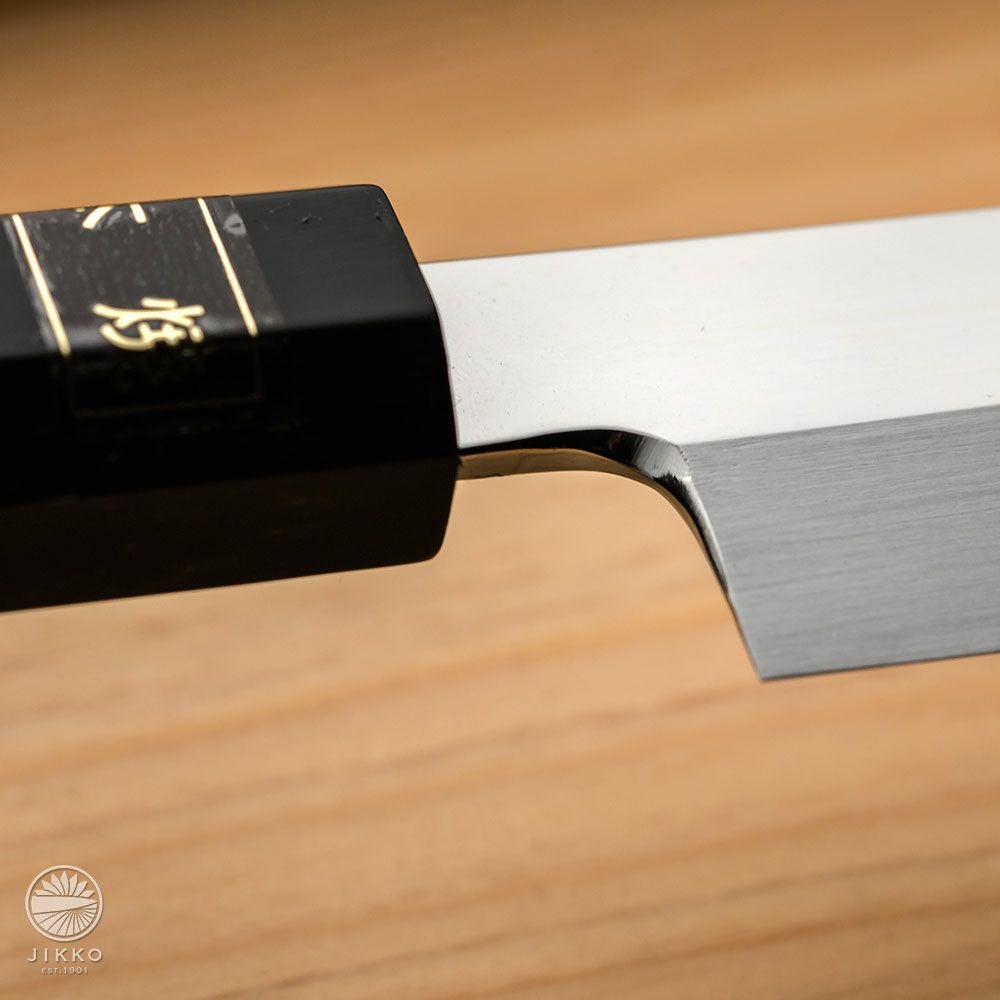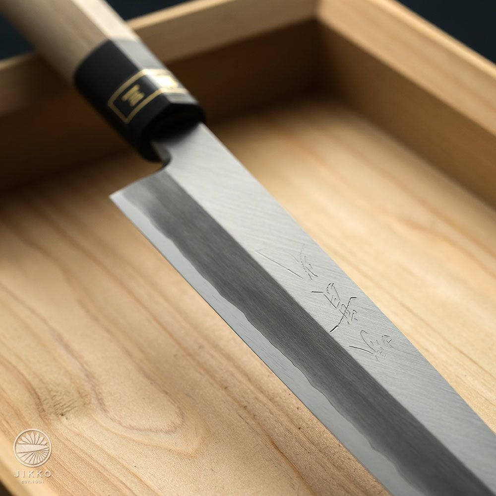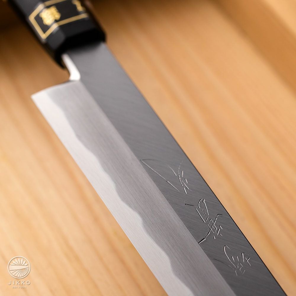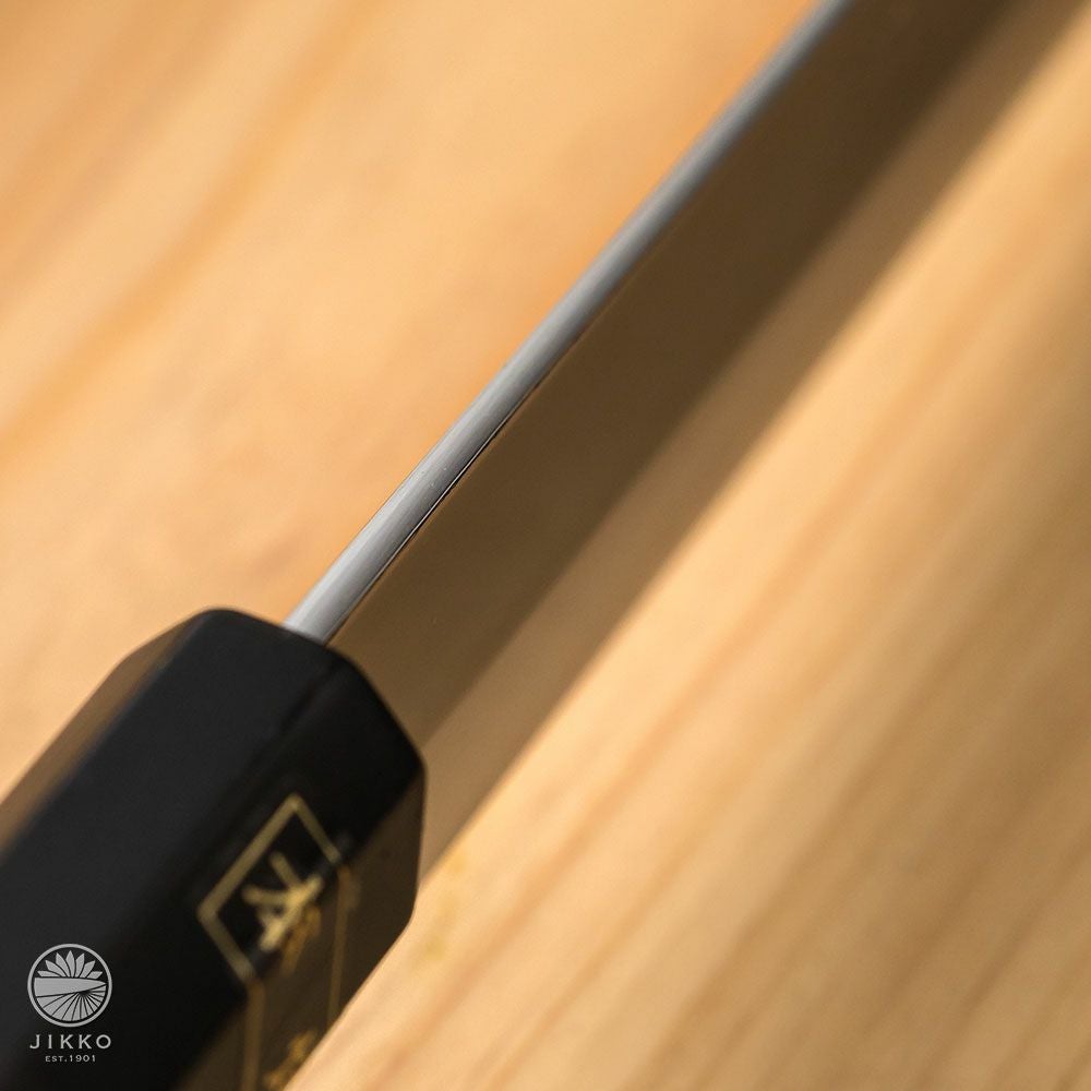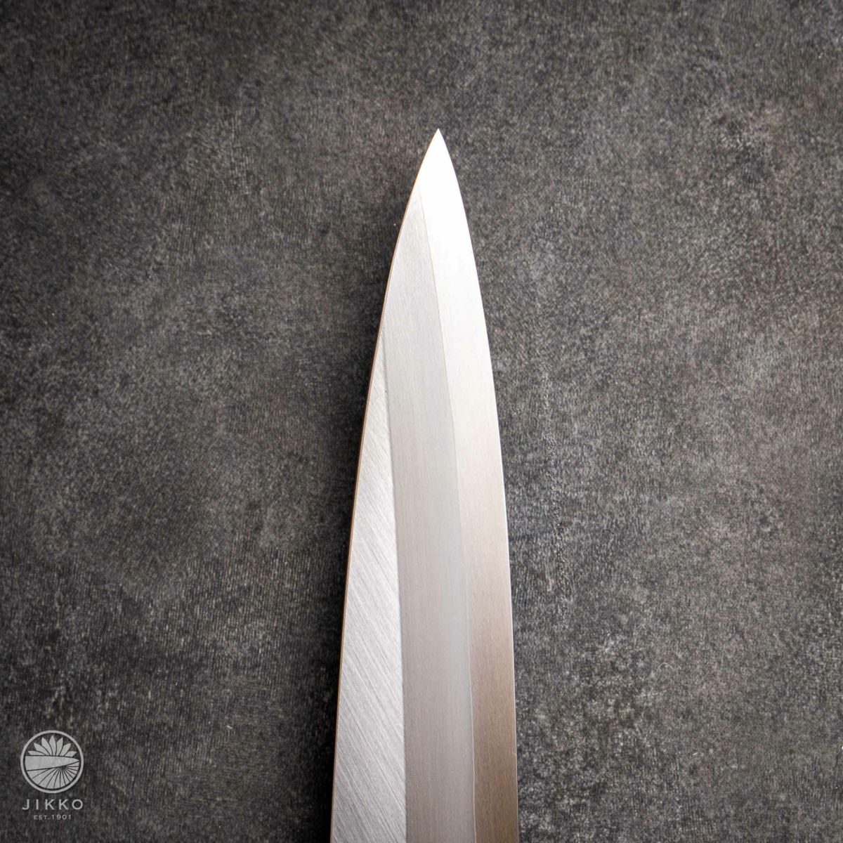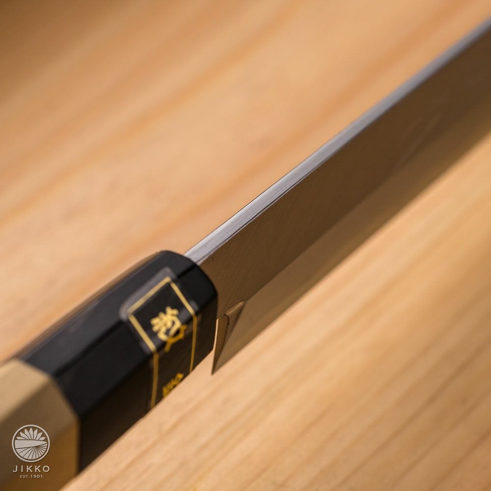 刺身包丁は日立金属の高級刃物鋼材が使われることが多いです。サビやすい炭素鋼系では、青紙、白紙があります。サビにくいステンレス系では銀三がございます。扱いやすくておすすめの鋼材は切れ味と研ぎやすさが両立した白紙2号です。切れ味の持続性を求めるのであれば青紙2号です。サビにくい物は銀三になります。