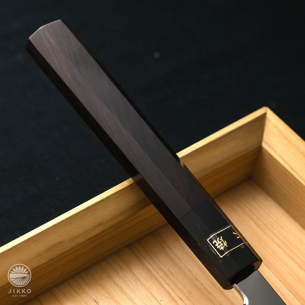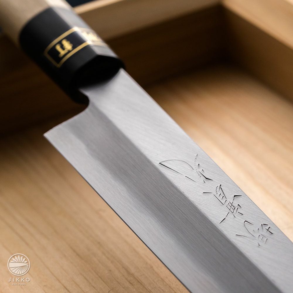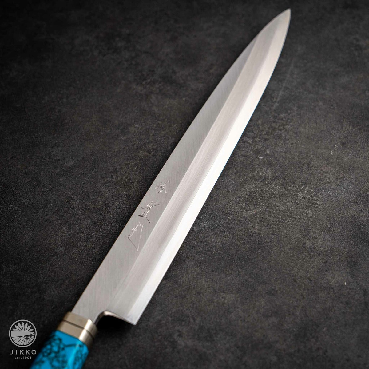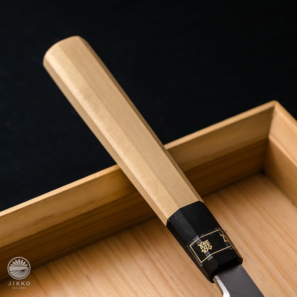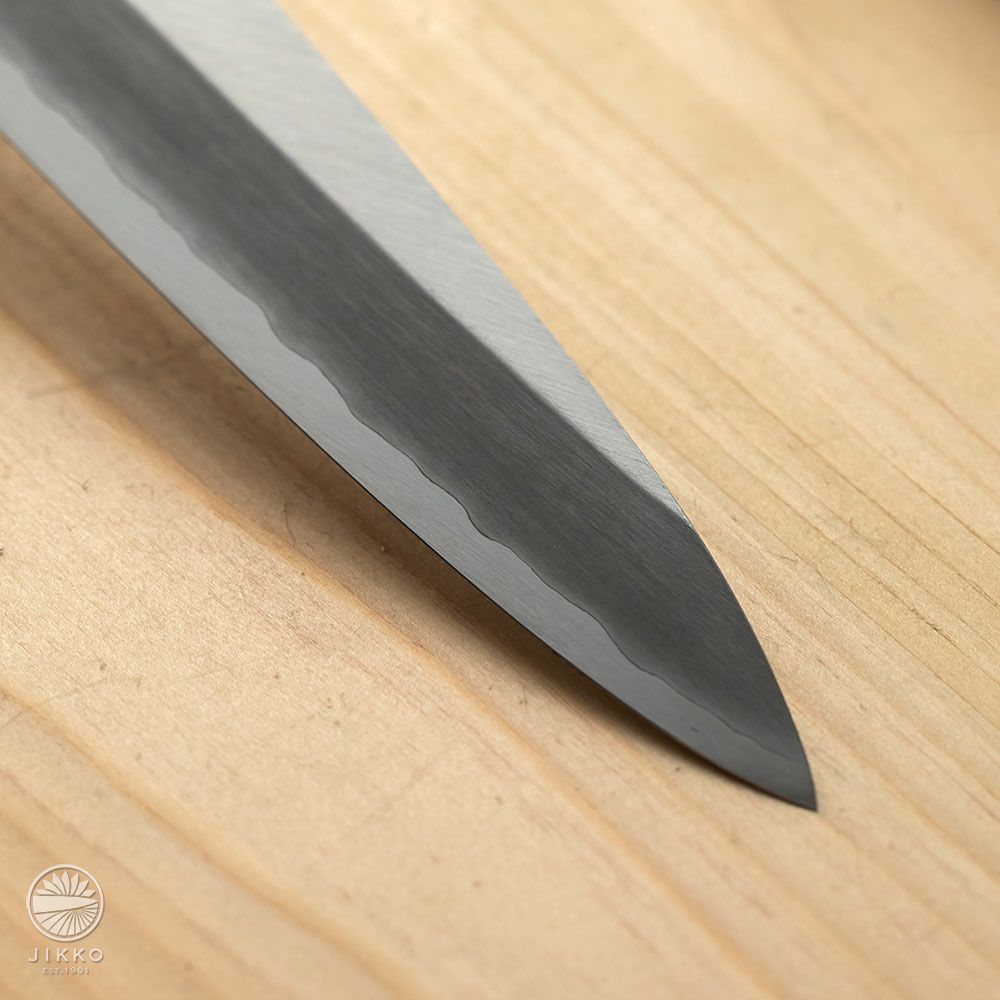 刺身包丁は日立金属の高級刃物鋼材が使われることが多いです。サビやすい炭素鋼系では、青紙、白紙があります。サビにくいステンレス系では銀三がございます。扱いやすくておすすめの鋼材は切れ味と研ぎやすさが両立した白紙2号です。切れ味の持続性を求めるのであれば青紙2号です。サビにくい物は銀三になります。