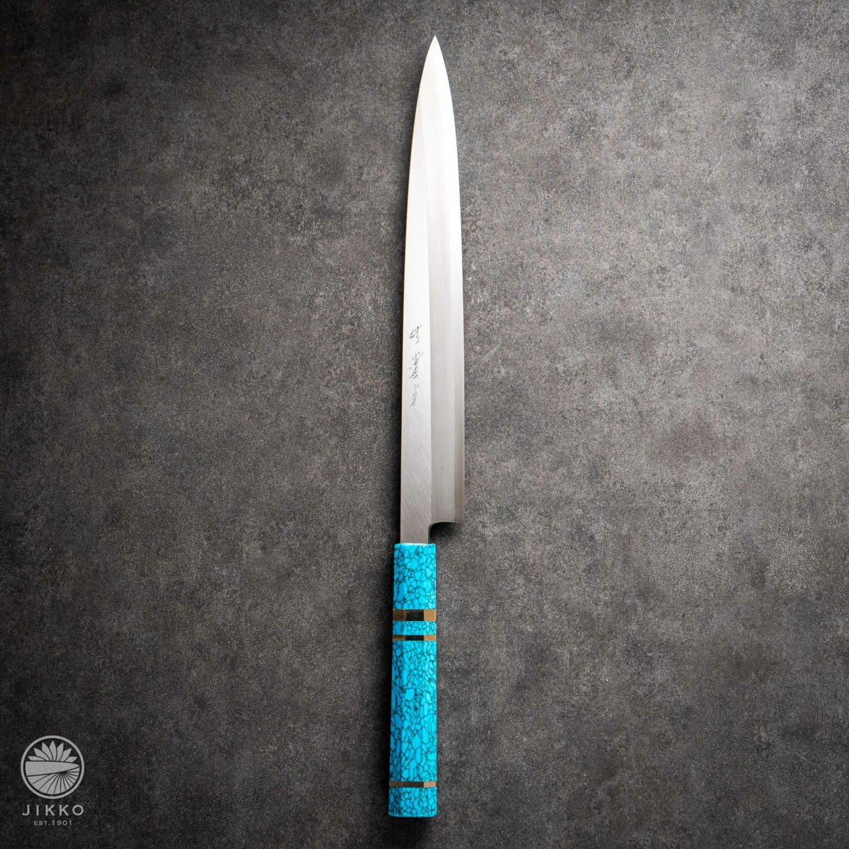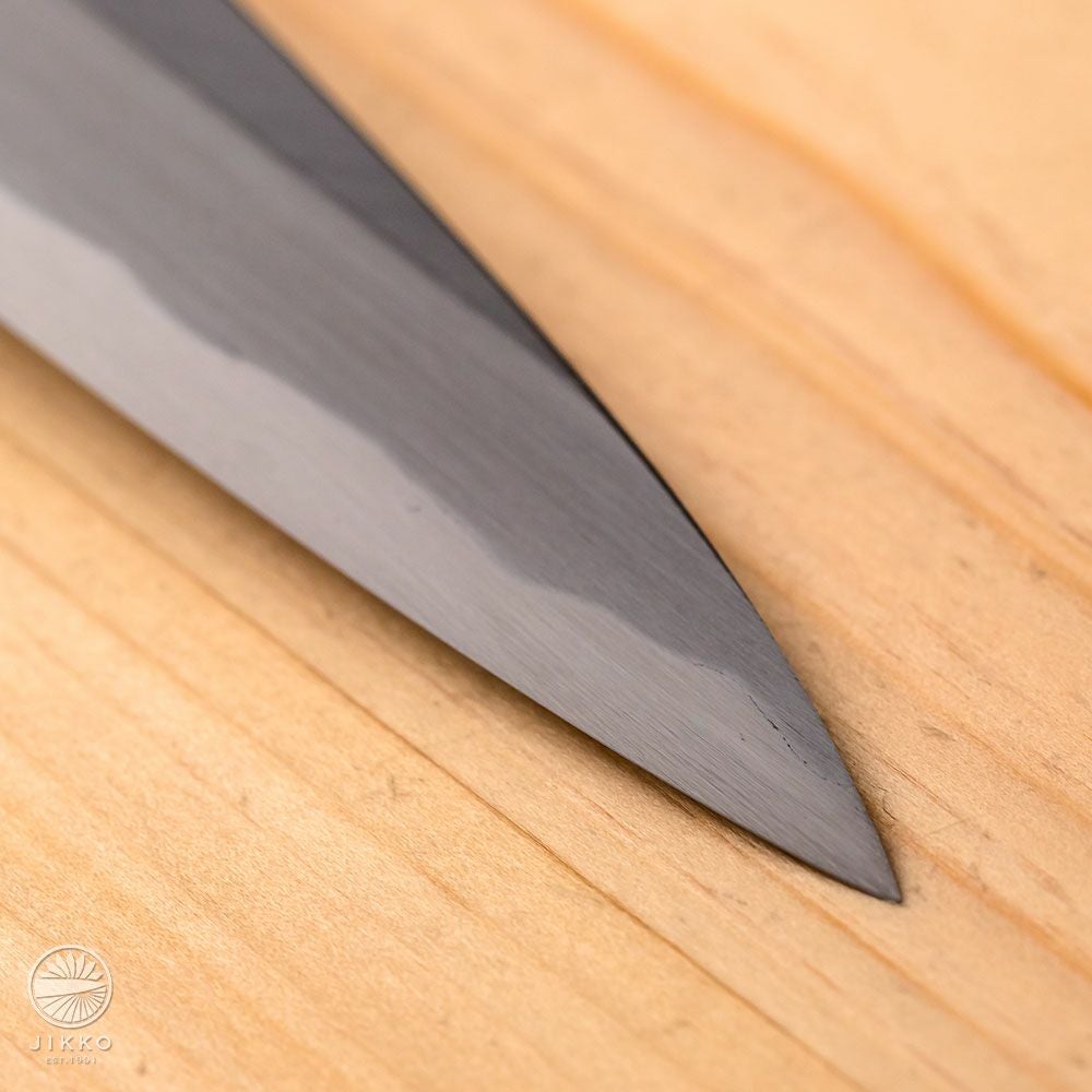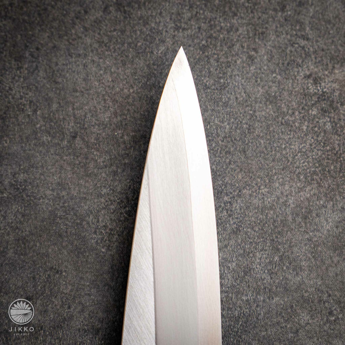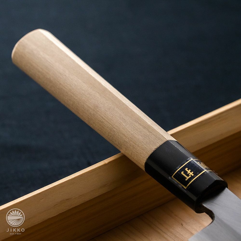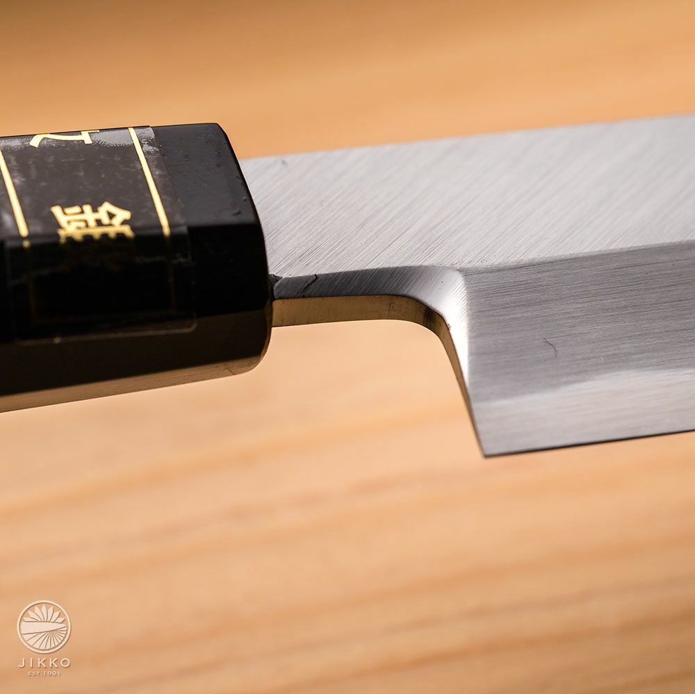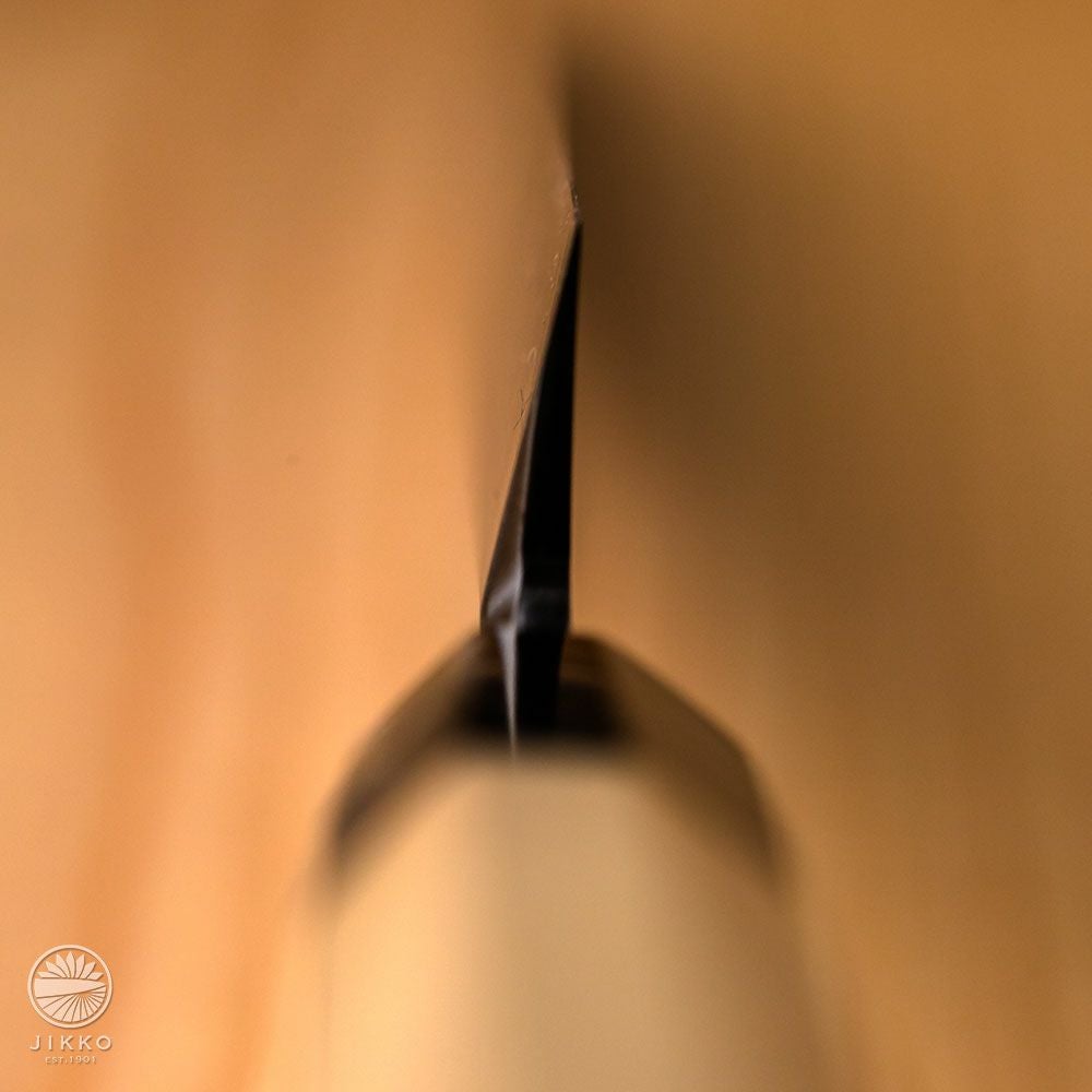 刺身包丁は日立金属の高級刃物鋼材が使われることが多いです。サビやすい炭素鋼系では、青紙、白紙があります。サビにくいステンレス系では銀三がございます。扱いやすくておすすめの鋼材は切れ味と研ぎやすさが両立した白紙2号です。切れ味の持続性を求めるのであれば青紙2号です。サビにくい物は銀三になります。