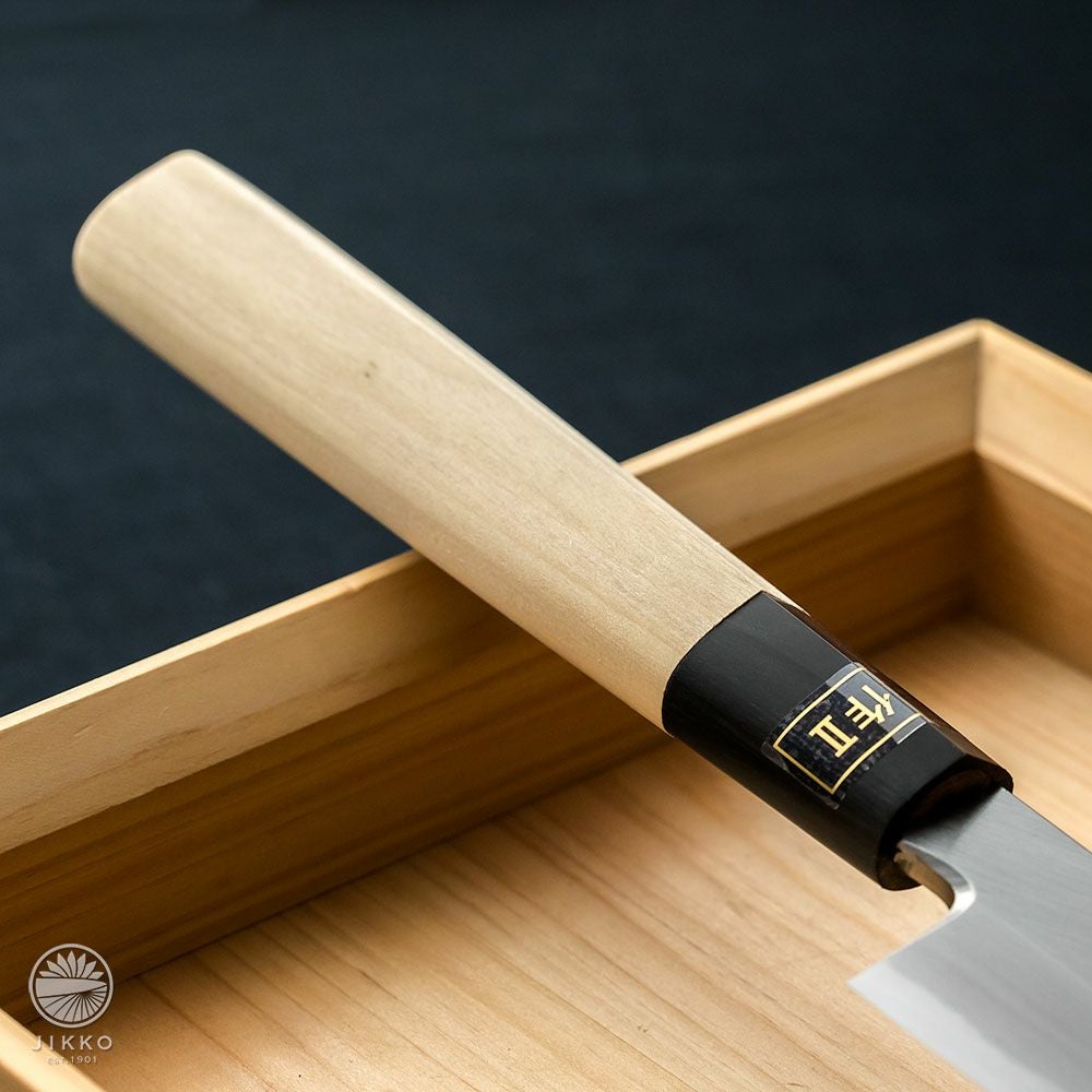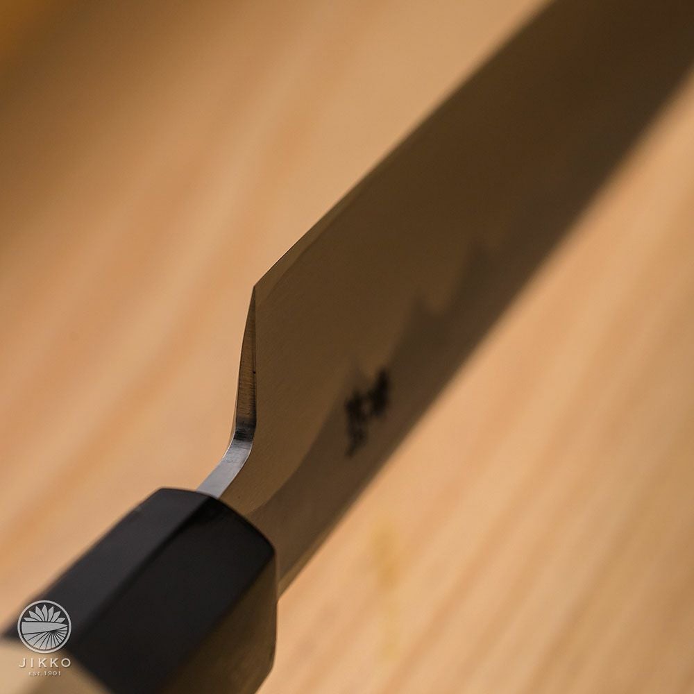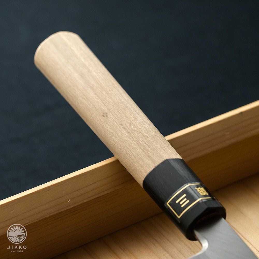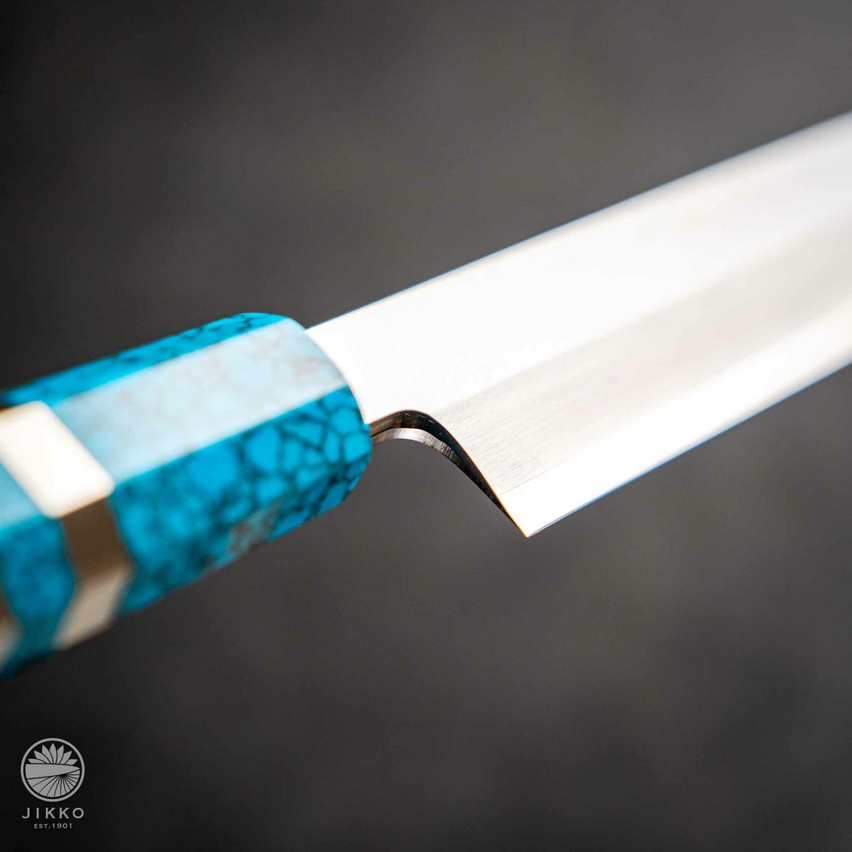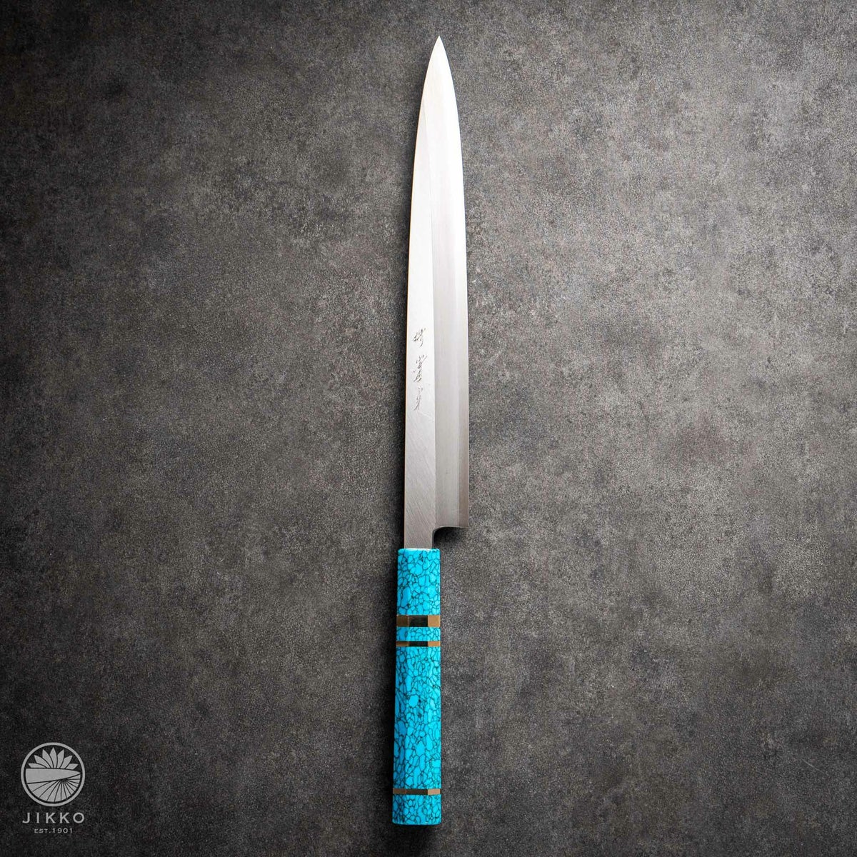 刺身包丁は日立金属の高級刃物鋼材が使われることが多いです。サビやすい炭素鋼系では、青紙、白紙があります。サビにくいステンレス系では銀三がございます。扱いやすくておすすめの鋼材は切れ味と研ぎやすさが両立した白紙2号です。切れ味の持続性を求めるのであれば青紙2号です。サビにくい物は銀三になります。