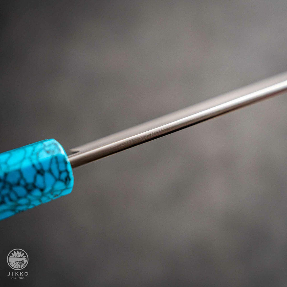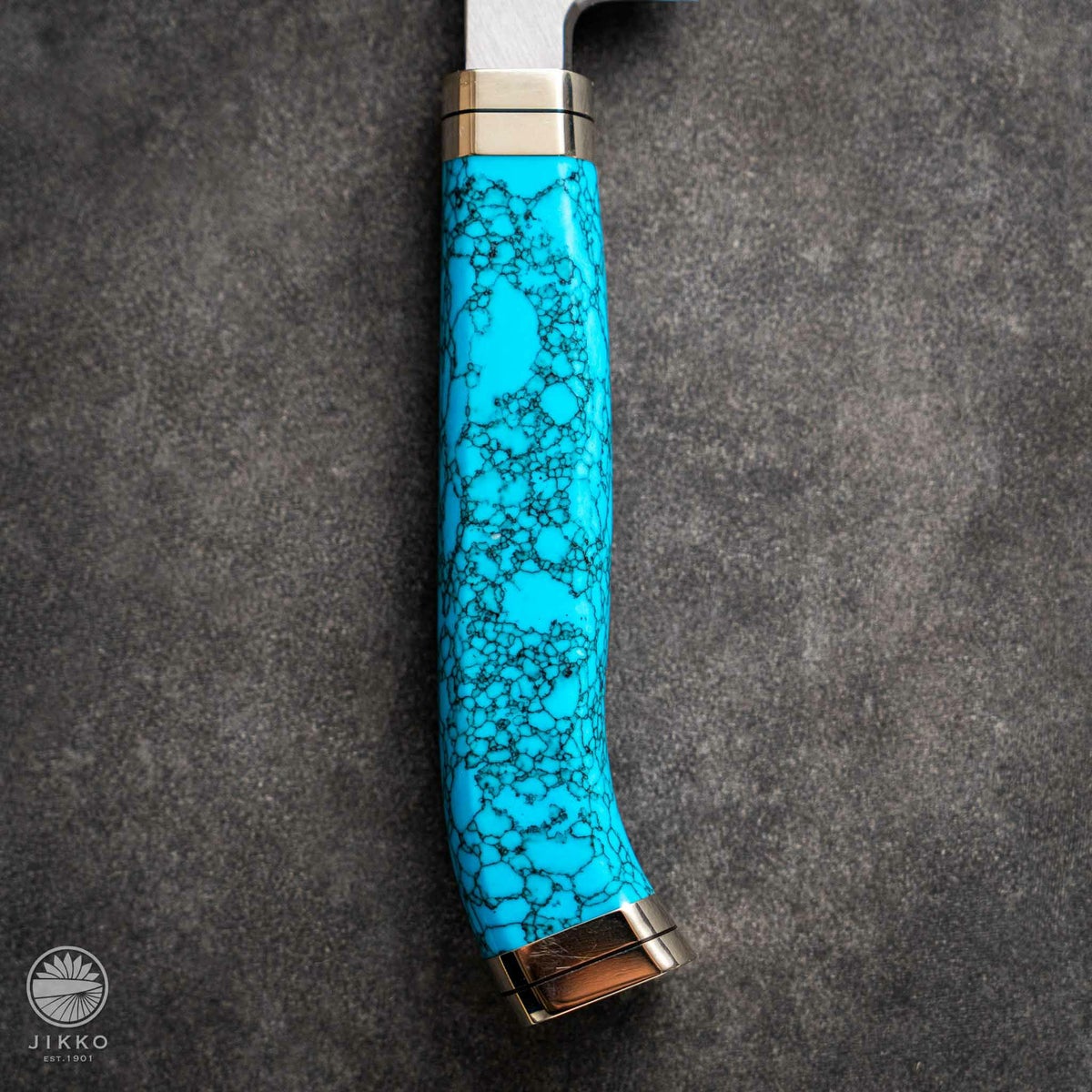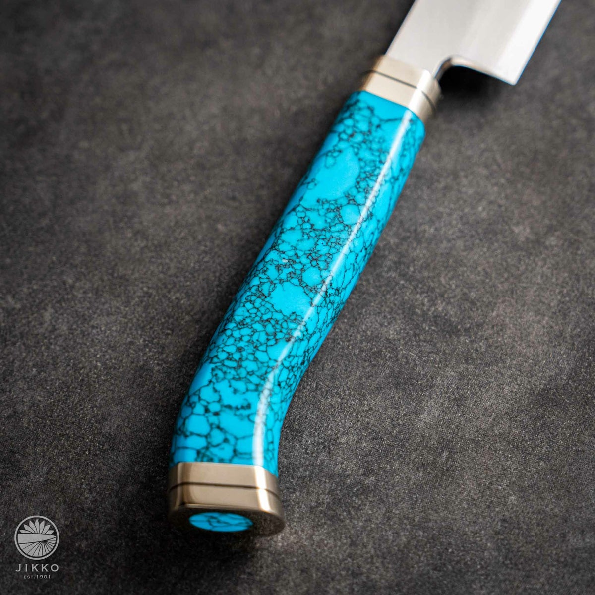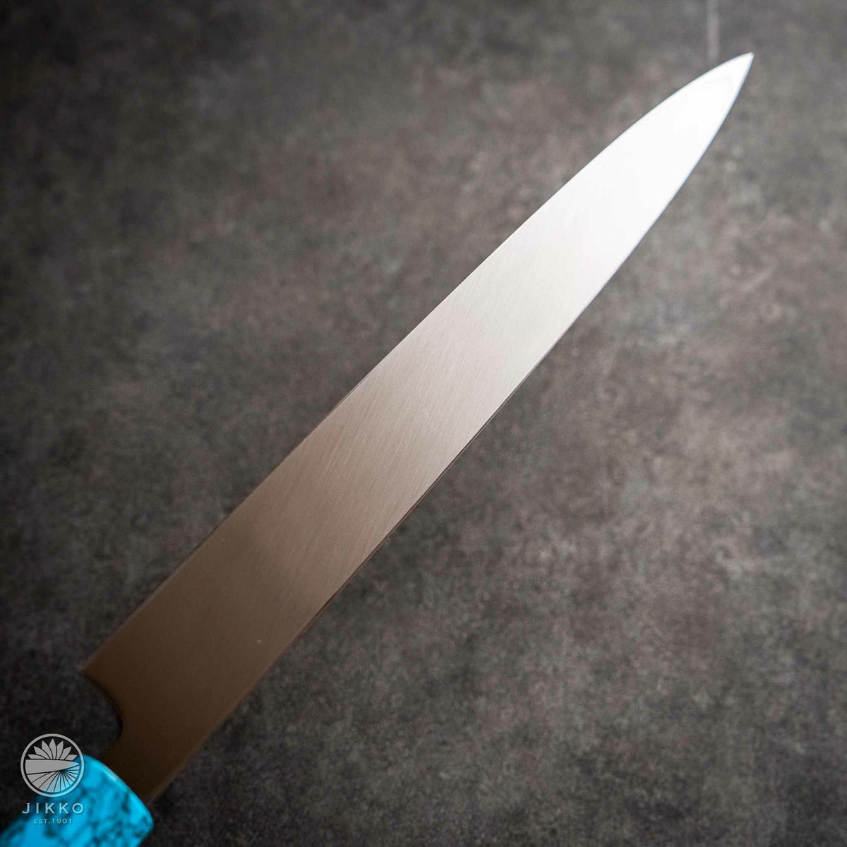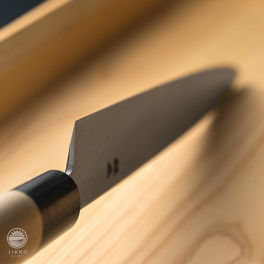 刺身包丁は日立金属の高級刃物鋼材が使われることが多いです。サビやすい炭素鋼系では、青紙、白紙があります。サビにくいステンレス系では銀三がございます。扱いやすくておすすめの鋼材は切れ味と研ぎやすさが両立した白紙2号です。切れ味の持続性を求めるのであれば青紙2号です。サビにくい物は銀三になります。