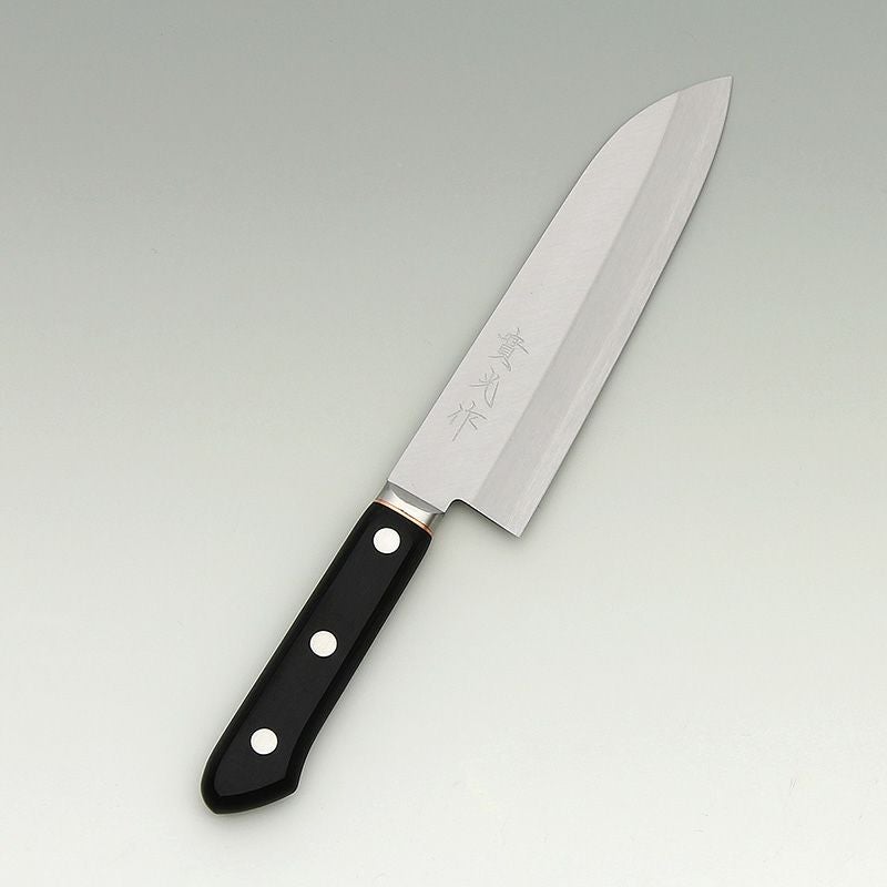 | 用途 | 三徳包丁(さんとくほうちょう)の三徳の意味は「三つの美徳」や「三つの用途」を意味していて、肉、魚、野菜など幅広い材料に対してさまざまな切り方が出来ることをあらわしています。家庭用として非常に一般的な包丁であり、最初の包丁として選ぶのに向いている。 |