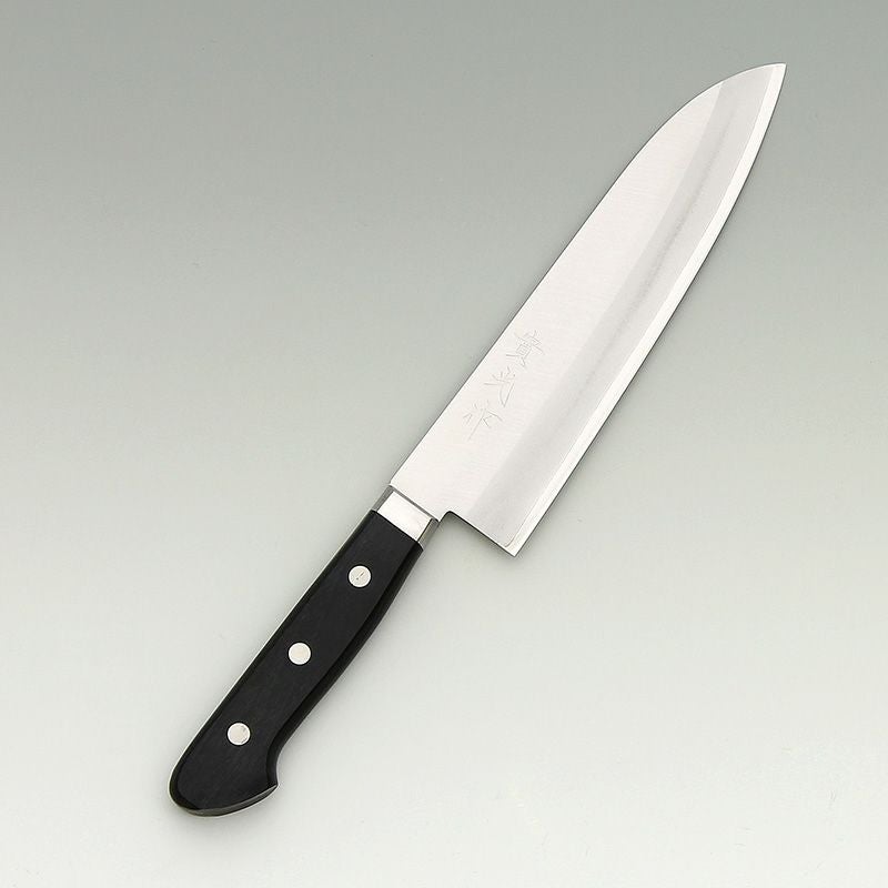| 用途 | 三徳包丁(さんとくほうちょう)の三徳の意味は「三つの美徳」や「三つの用途」を意味していて、肉、魚、野菜など幅広い材料に対してさまざまな切り方が出来ることをあらわしています。家庭用として非常に一般的な包丁であり、最初の包丁として選ぶのに向いている。 |