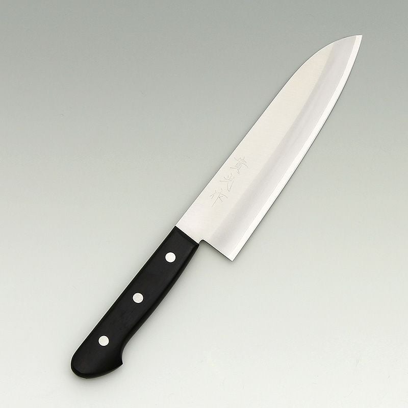 | 用途 | 三徳包丁(さんとくほうちょう)の三徳の意味は「三つの美徳」や「三つの用途」を意味していて、肉、魚、野菜など幅広い材料に対してさまざまな切り方が出来ることをあらわしています。家庭用として非常に一般的な包丁であり、最初の包丁として選ぶのに向いている。 |