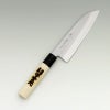 | 用途 | 三徳包丁(さんとくほうちょう)の三徳の意味は「三つの美徳」や「三つの用途」を意味していて、肉、魚、野菜など幅広い材料に対してさまざまな切り方が出来ることをあらわしています。家庭用として非常に一般的な包丁であり、最初の包丁として選ぶのに向いている。 |