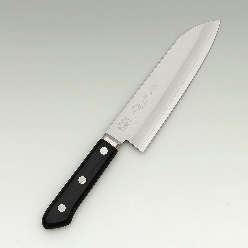 | 用途 | 三徳包丁(さんとくほうちょう)の三徳の意味は「三つの美徳」や「三つの用途」を意味していて、肉、魚、野菜など幅広い材料に対してさまざまな切り方が出来ることをあらわしています。家庭用として非常に一般的な包丁であり、最初の包丁として選ぶのに向いている。 |