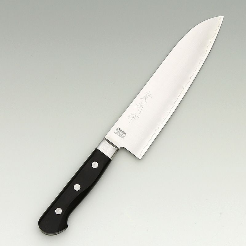 | 用途 | 三徳包丁(さんとくほうちょう)の三徳の意味は「三つの美徳」や「三つの用途」を意味していて、肉、魚、野菜など幅広い材料に対してさまざまな切り方が出来ることをあらわしています。家庭用として非常に一般的な包丁であり、最初の包丁として選ぶのに向いている。 |