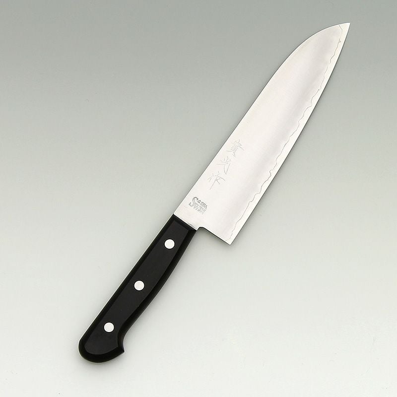 | 用途 | 三徳包丁(さんとくほうちょう)の三徳の意味は「三つの美徳」や「三つの用途」を意味していて、肉、魚、野菜など幅広い材料に対してさまざまな切り方が出来ることをあらわしています。家庭用として非常に一般的な包丁であり、最初の包丁として選ぶのに向いている。 |