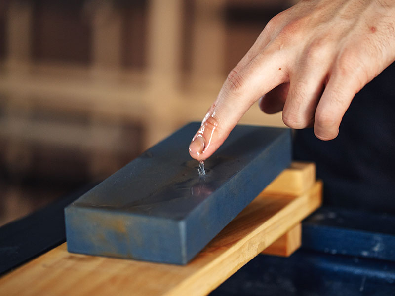 途中で砥石が乾いてきたら砥石が少し潤う程度に水を少しつけます。