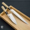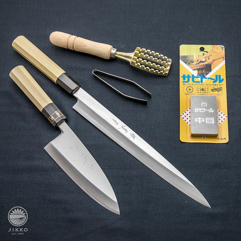 | 材質 | 刃身:出刃 青鋼2号, 刺身 青鋼1号,ウロコ取り 真鍮,骨抜き ステンレス, 柄部:出刃 八角水牛柄 刺身 八角水牛柄 |