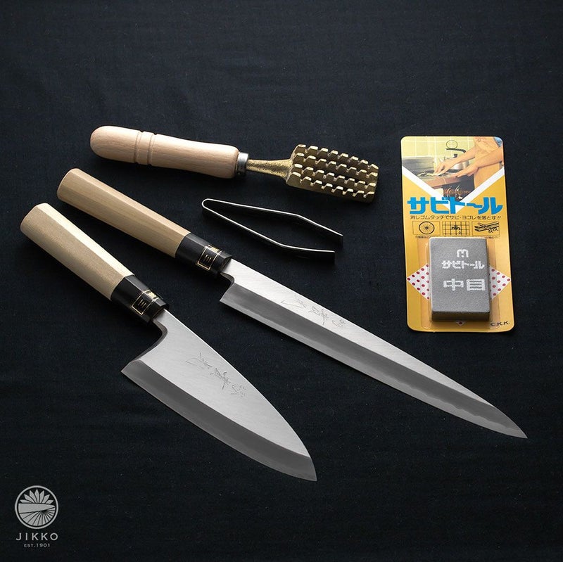 | 材質 | 刃身:出刃 銀三鋼, 刺身 銀三鋼,ウロコ取り 真鍮,骨抜き ステンレス, 柄部:出刃・刺身 水牛口輪柄 |