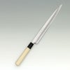 | 用途 | フグ引き包丁はてっさを切る専用の包丁です。てっさは包丁に厚みがあるとうまく切る事ができません。その為、ふぐ専用の包丁ができました。刺身包丁よりも刃幅が狭く、薄い包丁です。重量は薄い分軽いです。フグのてっさを切る時に薄く引くために刃は薄くしています。 てっさにするのに関東と関西では厚みに対する考え方が異なり、関東ではすごく薄く切りお皿に透き通るくらいが良いと言われています。関西ではある程度厚みと幅があるほうが旨みが感じられるので良いといわています。どちらにしても好みになると思いますが、てっさにはフグ引き包丁が必要になります。 |