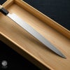 | 用途 | フグ引き包丁はてっさを切る専用の包丁です。てっさは包丁に厚みがあるとうまく切る事ができません。その為、ふぐ専用の包丁ができました。刺身包丁よりも刃幅が狭く、薄い包丁です。重量は薄い分軽いです。フグのてっさを切る時に薄く引くために刃は薄くしています。 てっさにするのに関東と関西では厚みに対する考え方が異なり、関東ではすごく薄く切りお皿に透き通るくらいが良いと言われています。関西ではある程度厚みと幅があるほうが旨みが感じられるので良いといわています。どちらにしても好みになると思いますが、てっさにはフグ引き包丁が必要になります。 |