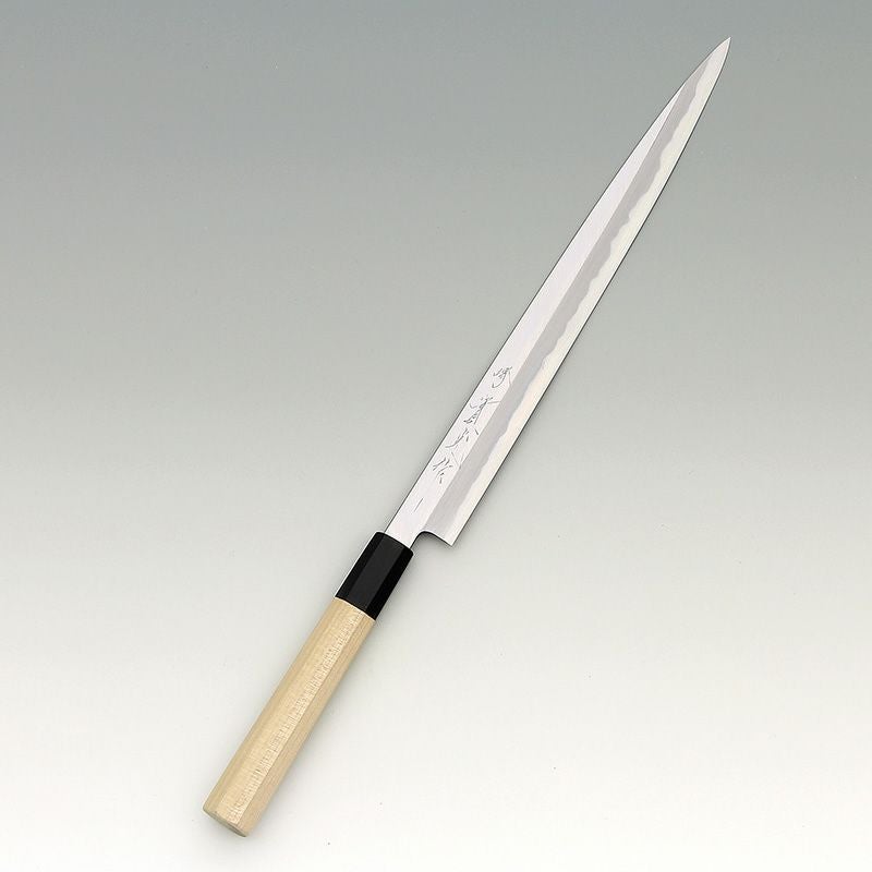 | 用途 | フグ引き包丁はてっさを切る専用の包丁です。てっさは包丁に厚みがあるとうまく切る事ができません。その為、ふぐ専用の包丁ができました。刺身包丁よりも刃幅が狭く、薄い包丁です。重量は薄い分軽いです。フグのてっさを切る時に薄く引くために刃は薄くしています。 てっさにするのに関東と関西では厚みに対する考え方が異なり、関東ではすごく薄く切りお皿に透き通るくらいが良いと言われています。関西ではある程度厚みと幅があるほうが旨みが感じられるので良いといわています。どちらにしても好みになると思いますが、てっさにはフグ引き包丁が必要になります。 |