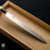 | 用途 | 刺身包丁は生の魚介類を刺身などにブロック状の切り身などを薄く引くのに適しています。角が立った美味しい刺身を引くには、刃渡りが必要になるため刺身包丁は基本的に細長い形状をしています。 |