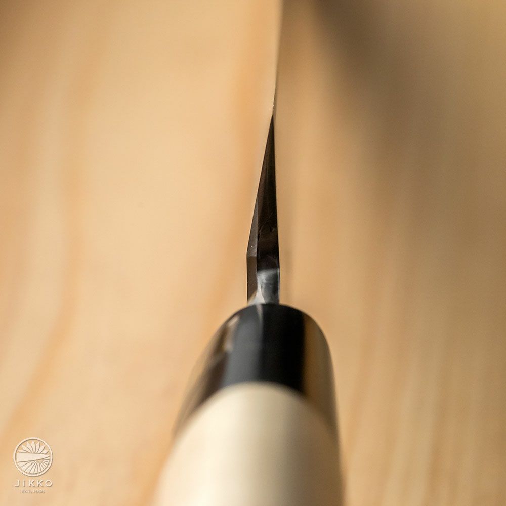 この工程によって購入後すぐにご使用して頂けます。さらに包丁の切れ味の持続性が向上し、次回ご自身で研ぐ時も砥石に当たりやすく容易に研ぎ直しが可能になります。この刃付け技術が實光刃物の切れ味のヒミツです。