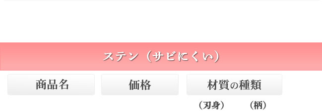 「ステンレス」はサビに強く使いやすい材質です。近年はハガネにも負けない切れ味のステンレスの材質もあります。