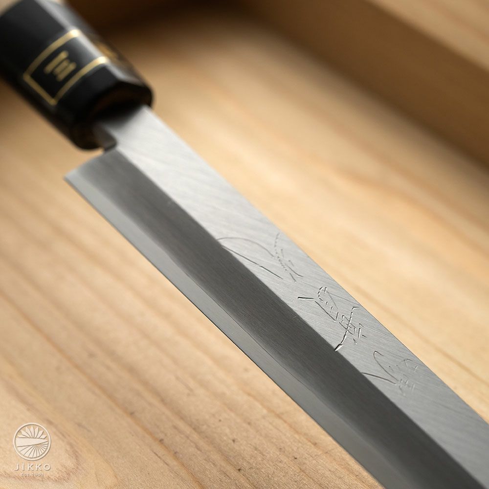 | 用途 | タコ引き包丁は蛸引包丁は和包丁の一つで、生の魚介類を刺身などにブロック状の切り身などを薄く切るために使われます。関東型の刺身包丁。刃の形状が刺身と違い刃先も四角くなっているのが特徴です。形は関西と関東で異なり、関西は切っ先(刃の先端)が調理しやすいように尖っていて刺身包丁といいます。先端が尖っていないのは喧嘩っ早い江戸っ子が喧嘩に使いにくいようにしたためだとも言われています。 |