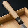 | 用途 | タコ引き包丁は蛸引包丁は和包丁の一つで、生の魚介類を刺身などにブロック状の切り身などを薄く切るために使われます。関東型の刺身包丁。刃の形状が刺身と違い刃先も四角くなっているのが特徴です。形は関西と関東で異なり、関西は切っ先(刃の先端)が調理しやすいように尖っていて刺身包丁といいます。先端が尖っていないのは喧嘩っ早い江戸っ子が喧嘩に使いにくいようにしたためだとも言われています。 |