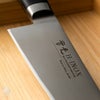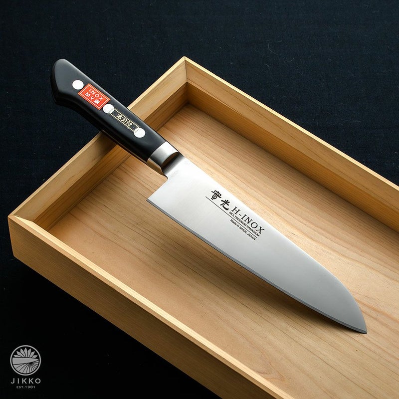 | 用途 | 三徳包丁(さんとくほうちょう)の三徳の意味は「三つの美徳」や「三つの用途」を意味していて、肉、魚、野菜など幅広い材料に対してさまざまな切り方が出来ることをあらわしています。家庭用として非常に一般的な包丁であり、最初の包丁として選ぶのに向いている。 |