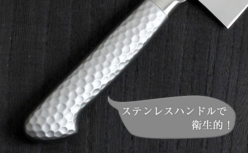 | 取り扱い注意 | 硬い食材(魚の骨・鳥の骨・牛の骨・豚の骨)や冷凍食材・冷凍肉の切断の際には必ず専門の包丁をご使用下さい。また食材に刃先をこじ入れる、切断中に包丁を左右に動す行為を行うと刃が欠ける恐れがございます。包丁の落下等も刃が欠ける恐れがございます。 |
