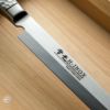 用途 | タコ引き包丁は蛸引包丁は和包丁の一つで、生の魚介類を刺身などにブロック状の切り身などを薄く切るために使われます。関東型の刺身包丁。刃の形状が刺身と違い刃先も四角くなっているのが特徴です。形は関西と関東で異なり、関西は切っ先(刃の先端)が調理しやすいように尖っていて刺身包丁といいます。先端が尖っていないのは喧嘩っ早い江戸っ子が喧嘩に使いにくいようにしたためだとも言われています。 |