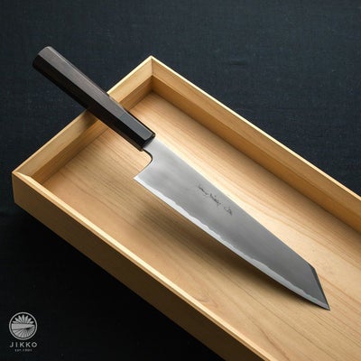 これまで家族や友人の祝い事に實光刃物さんの包丁を贈ってきたのですが、私自身はホームセンターのステンレス包丁(細かい材質不明)を使っていました。 特に切れ味に不満がなかったのですが、プレゼントしたお相手から『プレゼントしてくれた包丁怖いくらいに切れるよ!』と感想を頂き、遂にこの度私も購入するに至りました。 まず箱を開けて磨き上げられた刃に驚きました。 これから使うのが勿体ないと感じるほどに 次に切れ味。 包丁の重量だけで野菜がスッと切れ、肉は力を入れずに撫でるだけで切れ『これが本物の切れ味なのか』と感動しました。 今後は出刃包丁、刺身包丁の購入検討していますが、實光刃物さんで必ず購入したいと思います。