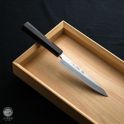 以前牛刀を實光さんで購入しましたが、ペティナイフも欲しくなりこちらを購入しました。 片刃の和ペティという珍しい作りで、刃渡りが小さいのに裏押し、裏すきがしっかりあり非常に美しくかっこいいペティナイフです。 片刃特有の斜めに切り込む特徴は刃の幅が狭い為かあまり感じず、片刃初心者でも使いやすいと感じました。 肝心の切れ味は文句無しで抜群の切れ味で大変満足しております。 まだ買い揃えたい包丁が数本ありますが、引き続き實光さんで買いたいと思います。
