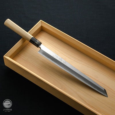 月に2回ほど丸のまま魚を買って来て捌いて食べる素人です。これまで海外の某有名メーカーの片刄のステンレス刺身包丁を使っていました。今回購入した包丁はツバスが豆腐を切るように切れ、マグロはゼリーを切るように包丁の自重(軽い)だけで切れた感じがしてびっくりしました。かなり切れ味が違うと思います。大事に使わせていただきます。