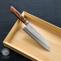 切れ味等のレビューでなくすみません。 プレゼントでのおすすめレビューです。 先日、息子と息子の婚約者を連れてリンクス梅田店にお邪魔しました。2人の結婚祝いに包丁を贈ろう考えました。結婚祝いに刃物?と心配される方もいらっしゃると思いますが未来を切り開くとか他にも色々と意味があり縁起物のようです。 私自身はSG2の三徳包丁と考えていたのですが当人2人は長さ重さ等、実際に手にとって確認。またこの鋼材と同じ銀三の包丁で試し切りもさせていただきこの包丁に辿り着きました。 リンクス梅田店のスタッフ様は本当にテキパキと実物を出してくださり私たち素人にも分かりやすくアドバイスしてくださいました。スタッフ様のご提案もありこの包丁の同じシリーズのペティナイフもセット購入。レーザー彫刻で名入れもしていただきました。 本当に實光刃物様に相談して良かったです。ありがとうございました。