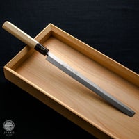 料理人になって、50年になります。本当は、フグ引きが欲しく、〇マゾンさんに発注かけてたのですが、在庫なく一旦は、あきらめていました。が、ある日 實光刃物さんを見かけて、とりこになり、どうせ買うならと、タコ引き包丁にしたのですが、思った以上に切れ味抜群で、とても綺麗な出来上がりに、二度も三度も驚かされる次第です。いつ来るか、待たされ感がすごくありましたが、切れることは勿論のこと、實光刃物さんの親切丁寧な対応にも、驚かされるました。初めての試みでしたが、誠実さとか、いっぺんに虜になりました。料理を作るのがもっと楽しくなりました。これからも、よろしくお願いいたします。