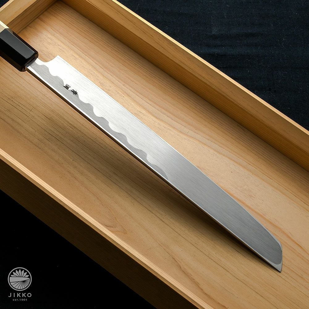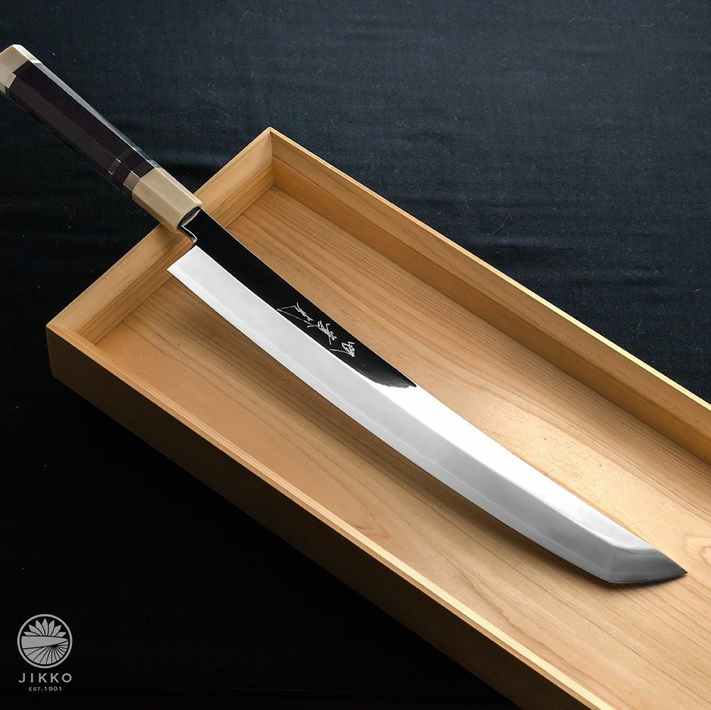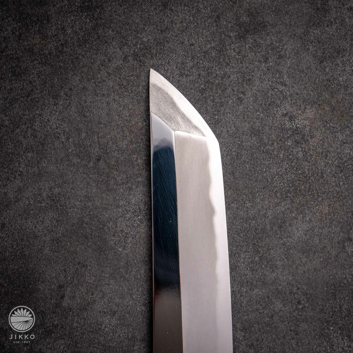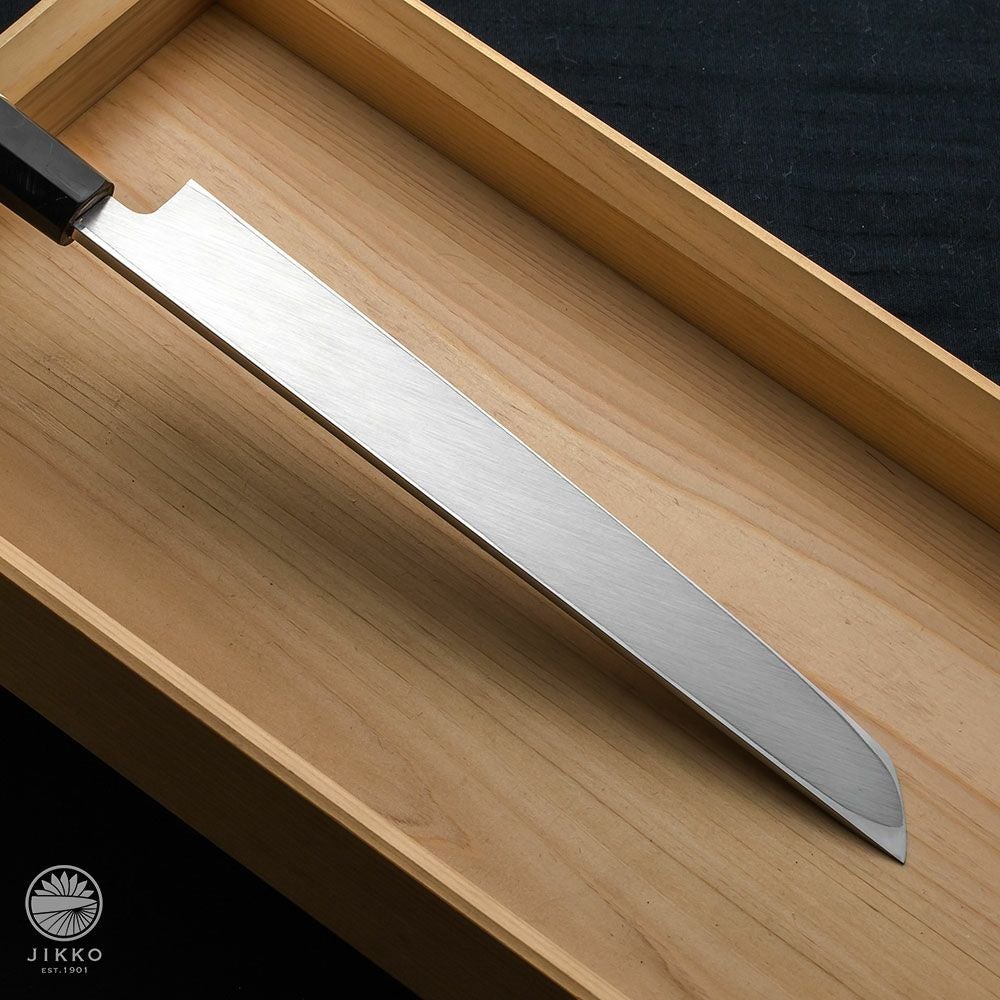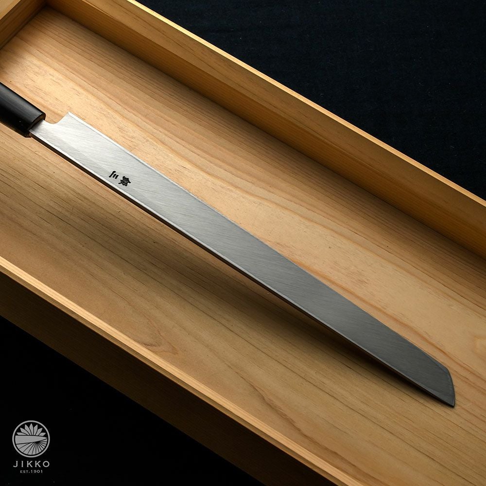 他の画像を見る 【刀心 本焼】先丸刺身包丁 銀3 本焼 鏡面 先丸 当店価格 ¥ 355,630 税込 +詳しく見る 日本刀のような見た目のデザインが人気です。サビにくく切れ味が良い銀三を使用しています。サビにくい包丁をお探しの方にお勧めです。 詳細を見る お気に入りに登録する