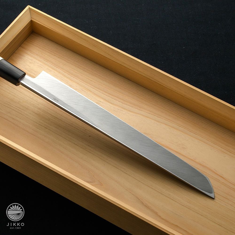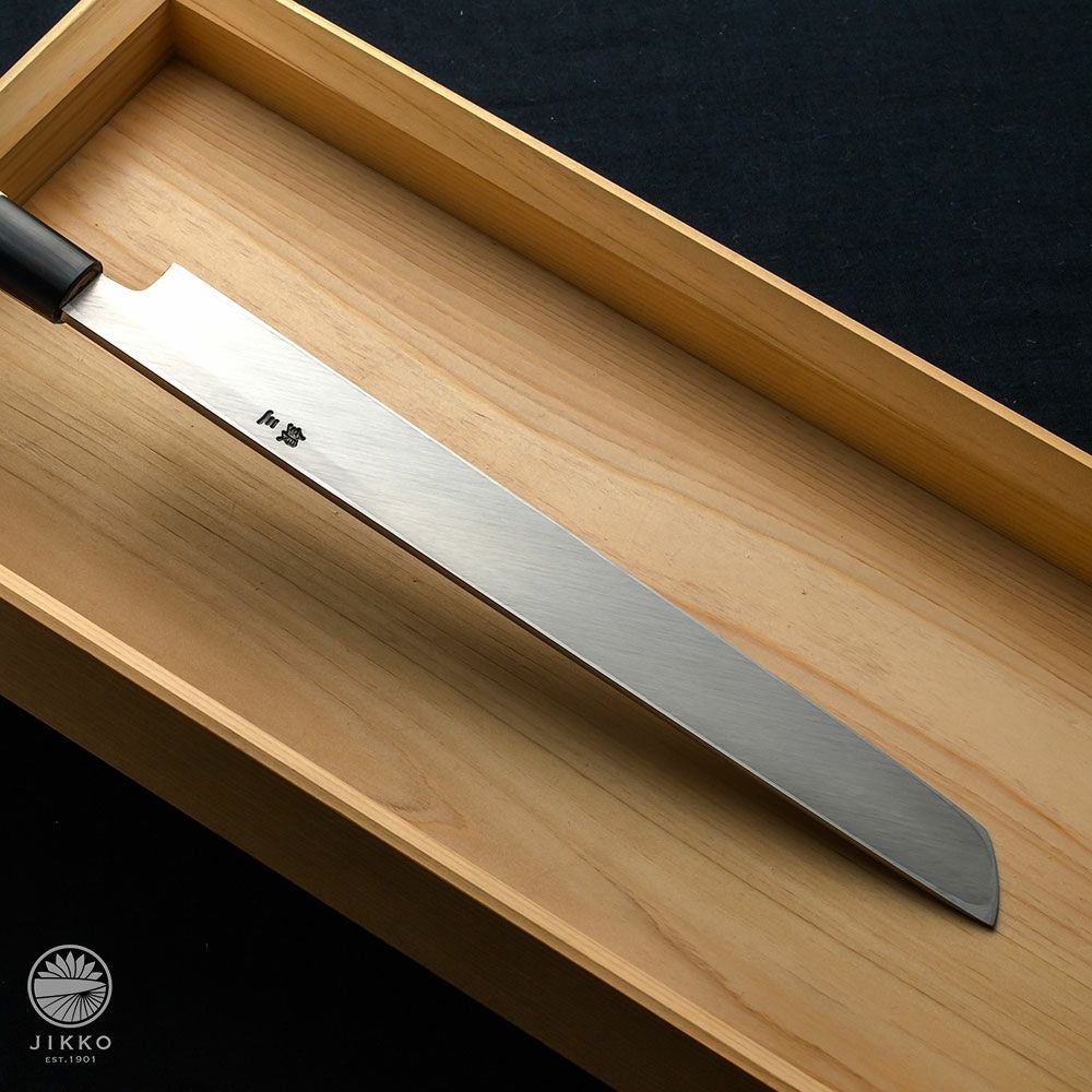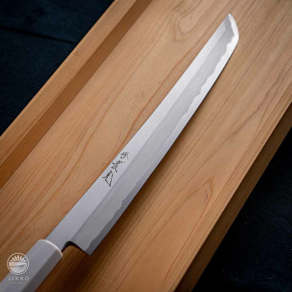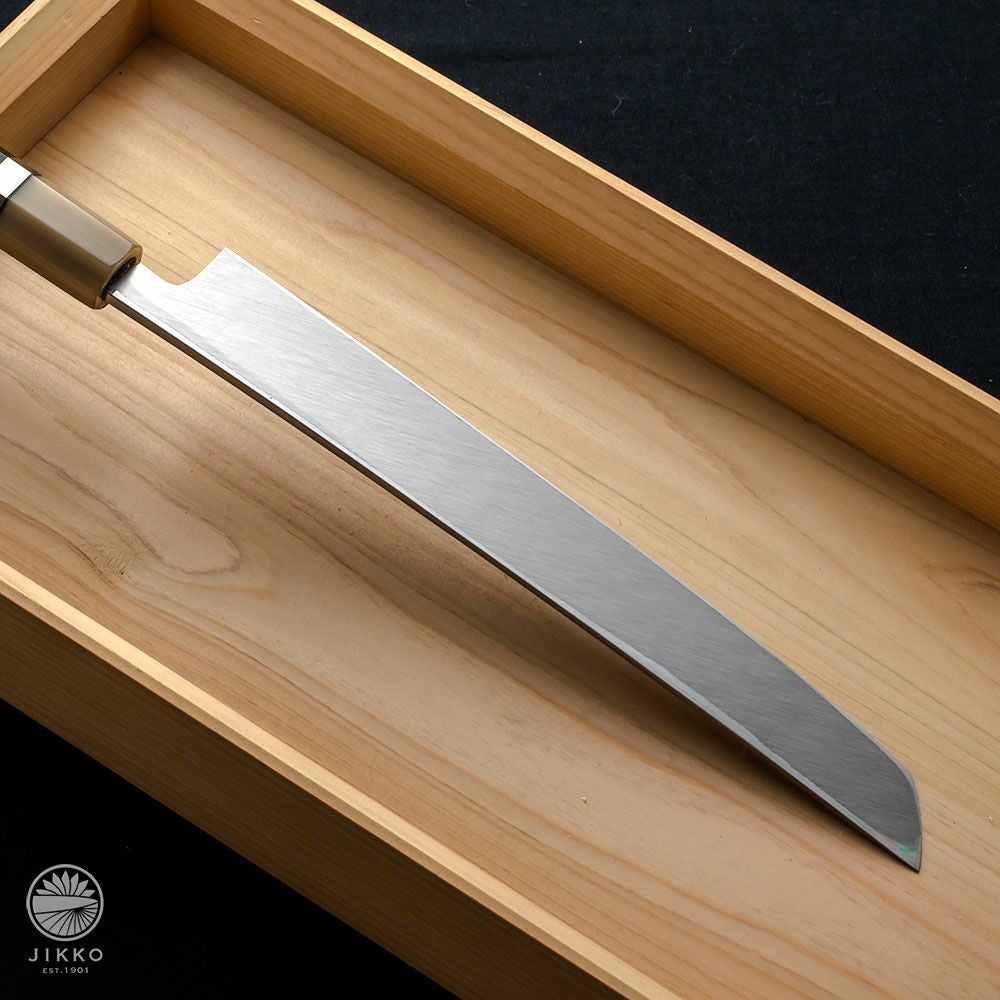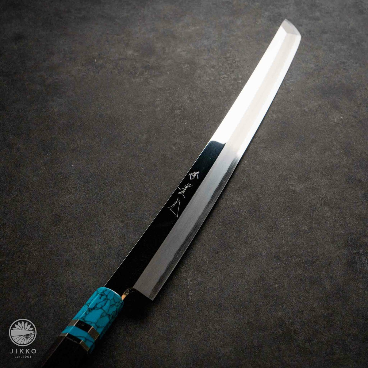 他の画像を見る 【刀心 本焼】先丸刺身包丁 銀3 本焼 鏡面 先丸 当店価格 ¥ 355,630 税込 +詳しく見る 日本刀のような見た目のデザインが人気です。サビにくく切れ味が良い銀三を使用しています。サビにくい包丁をお探しの方にお勧めです。 詳細を見る お気に入りに登録する