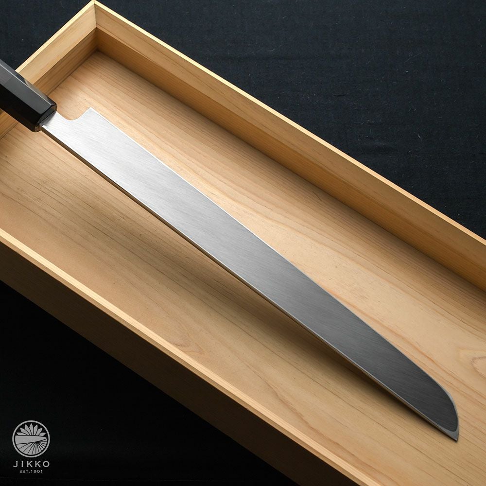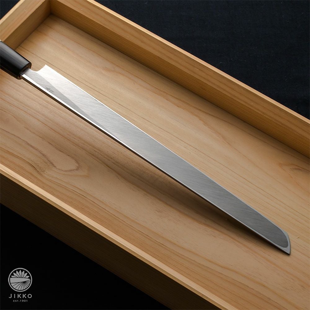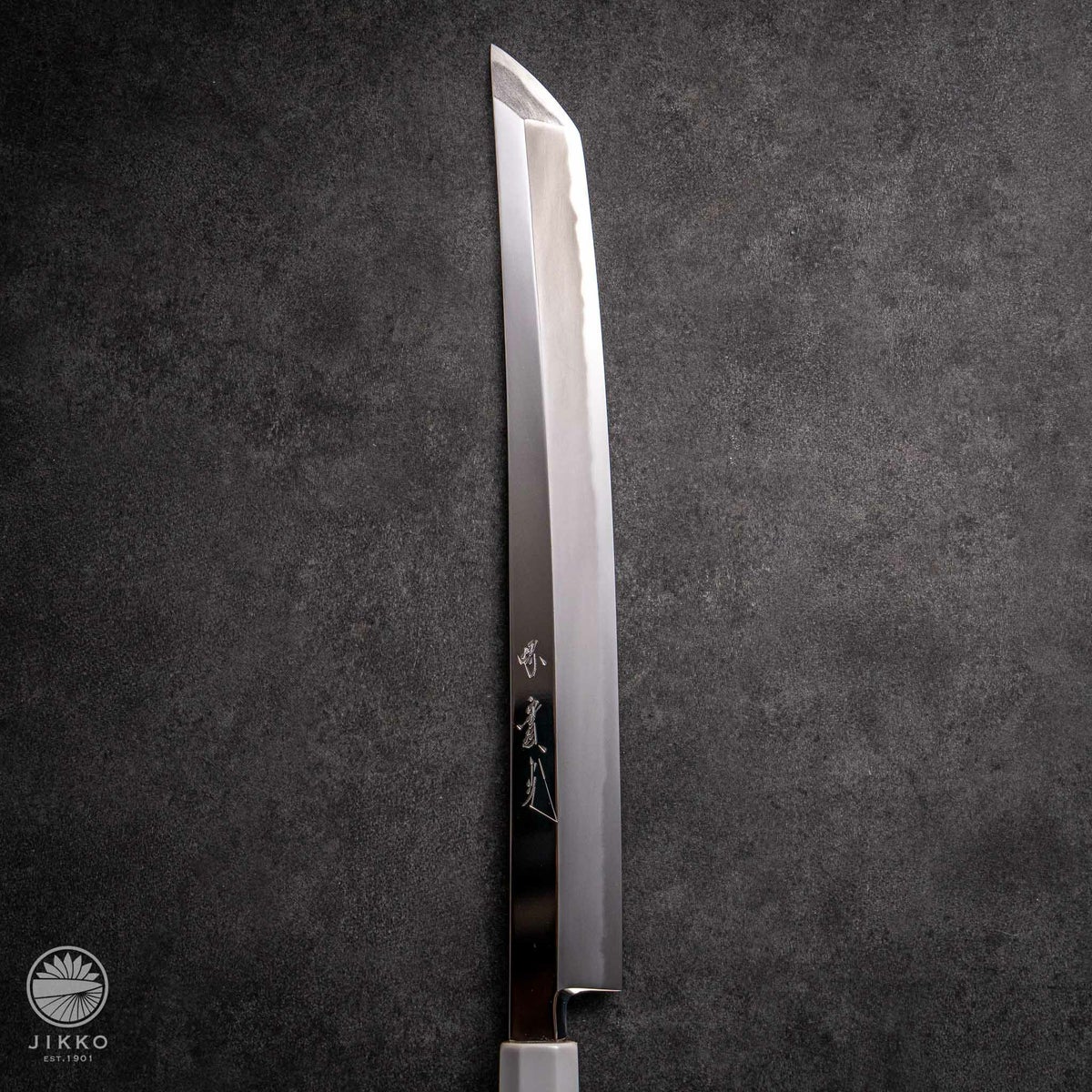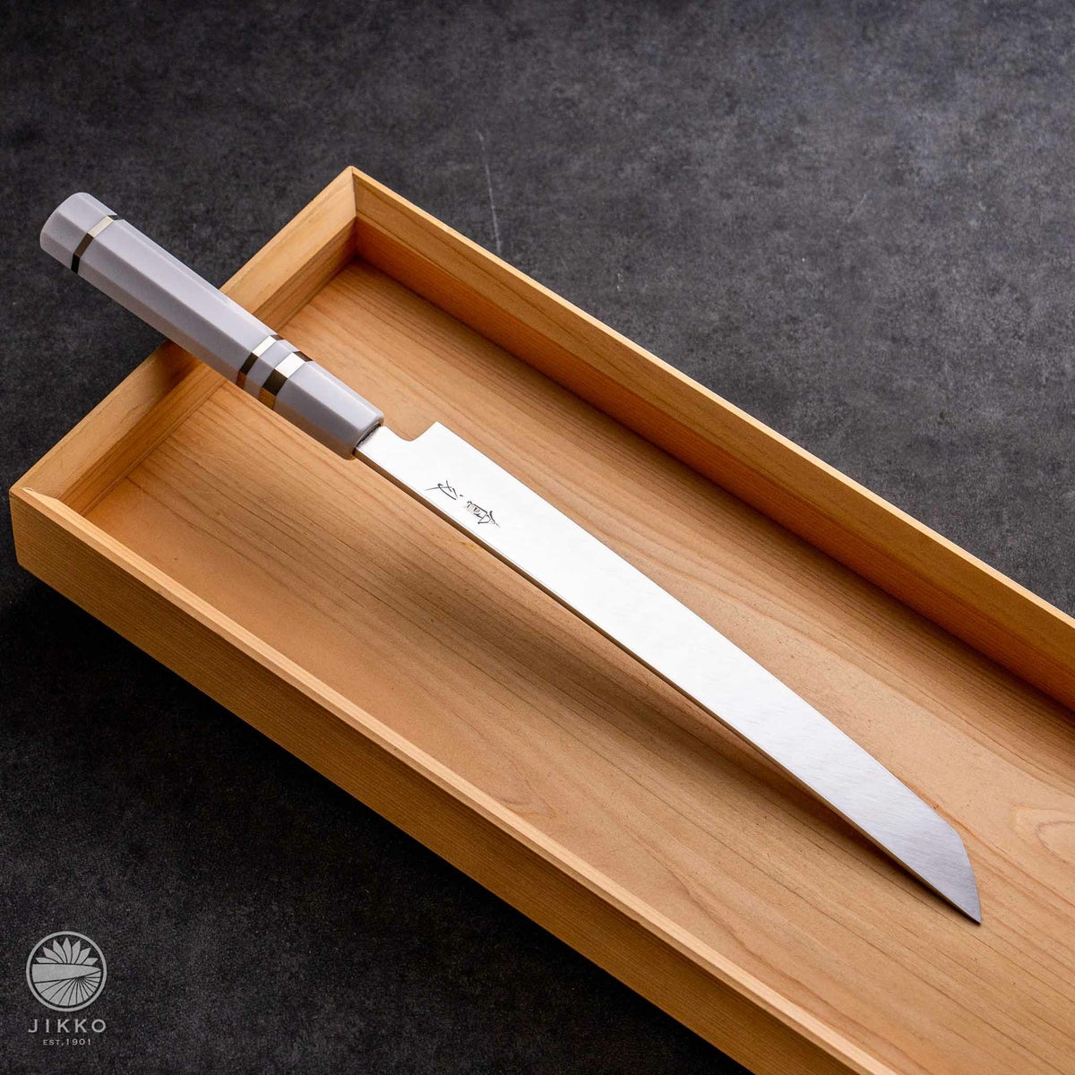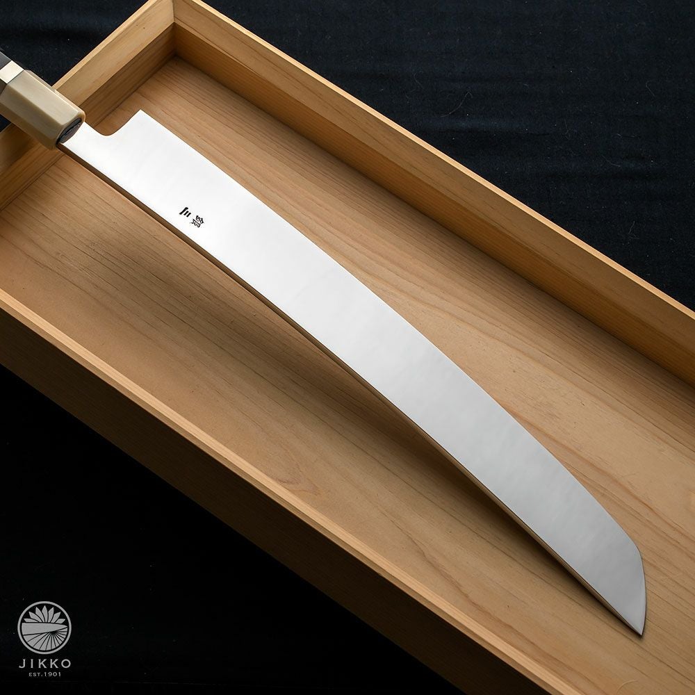 他の画像を見る 【刀心 本焼】先丸刺身包丁 銀3 本焼 鏡面 先丸 当店価格 ¥ 355,630 税込 +詳しく見る 日本刀のような見た目のデザインが人気です。サビにくく切れ味が良い銀三を使用しています。サビにくい包丁をお探しの方にお勧めです。 詳細を見る お気に入りに登録する