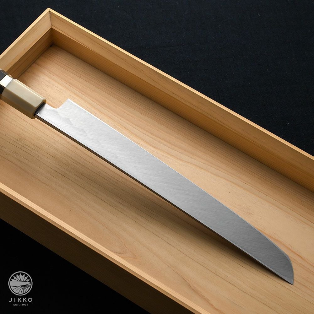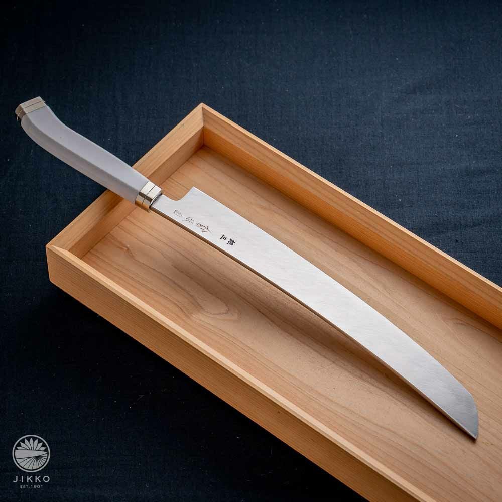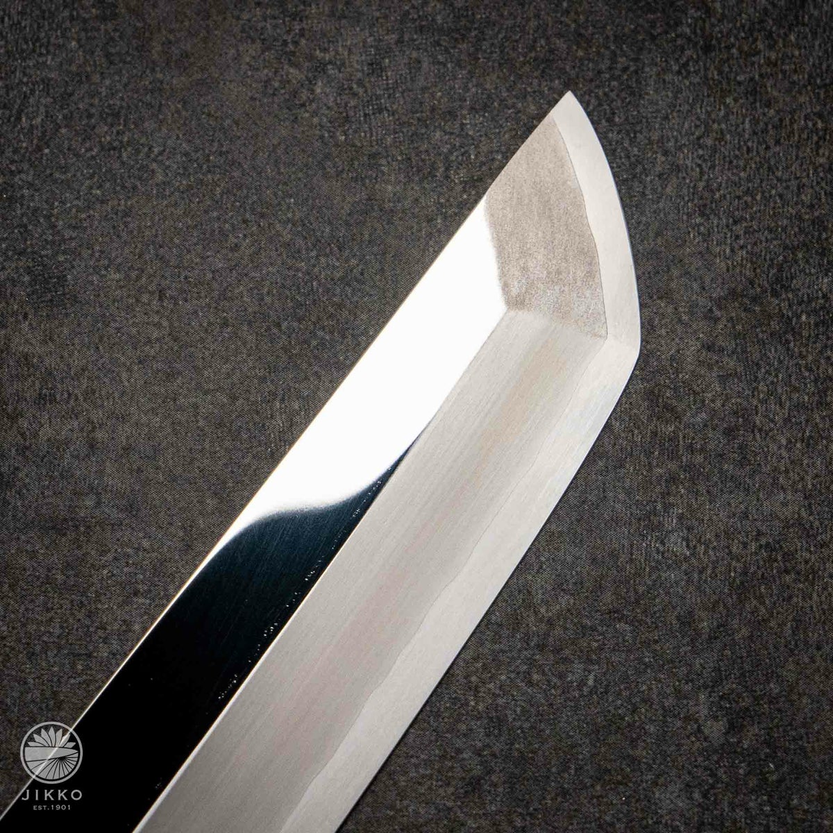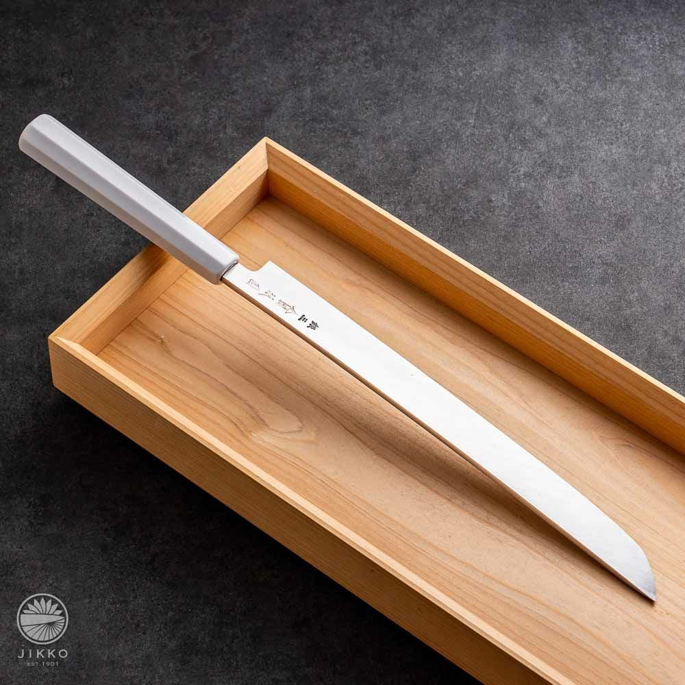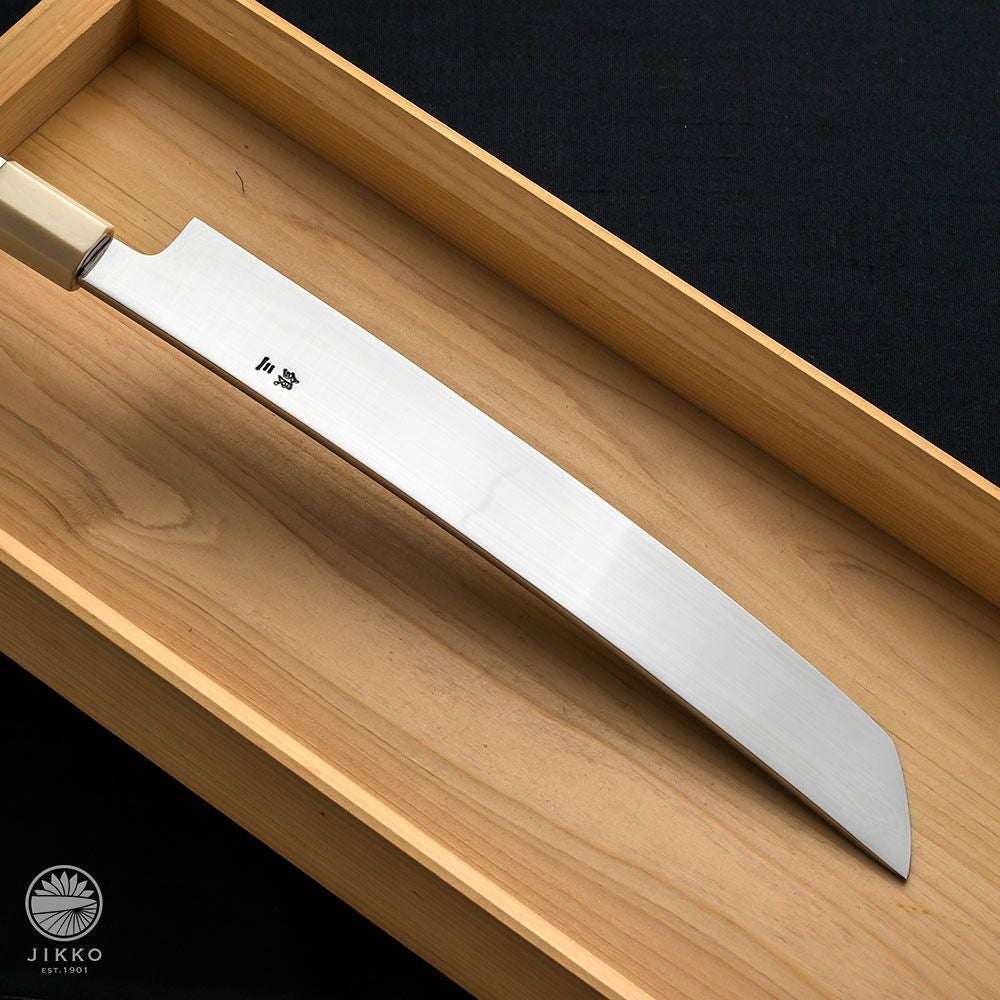 他の画像を見る 【刀心 本焼】先丸刺身包丁 銀3 本焼 鏡面 先丸 当店価格 ¥ 355,630 税込 +詳しく見る 日本刀のような見た目のデザインが人気です。サビにくく切れ味が良い銀三を使用しています。サビにくい包丁をお探しの方にお勧めです。 詳細を見る お気に入りに登録する