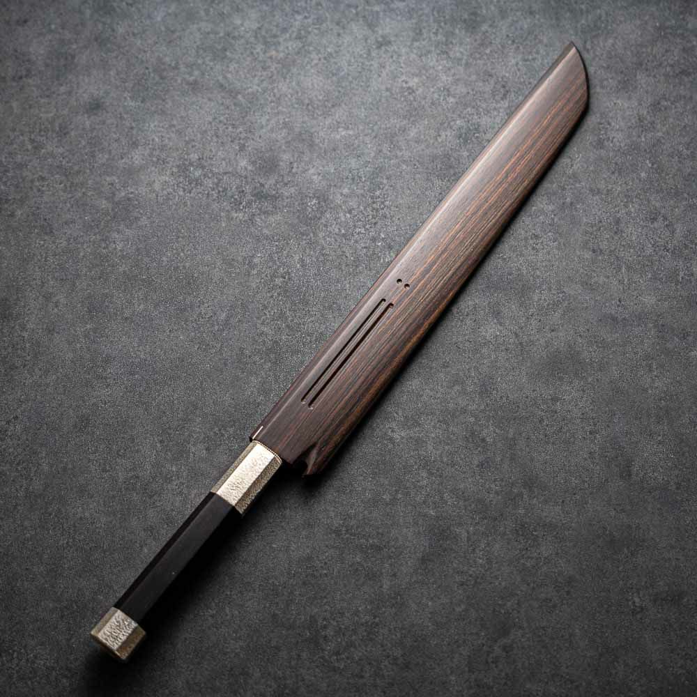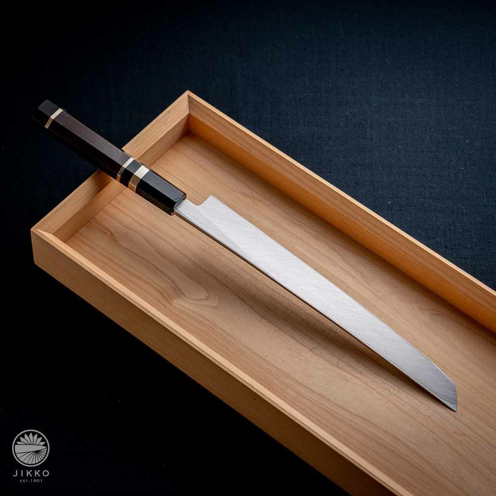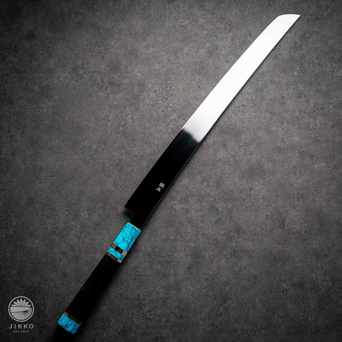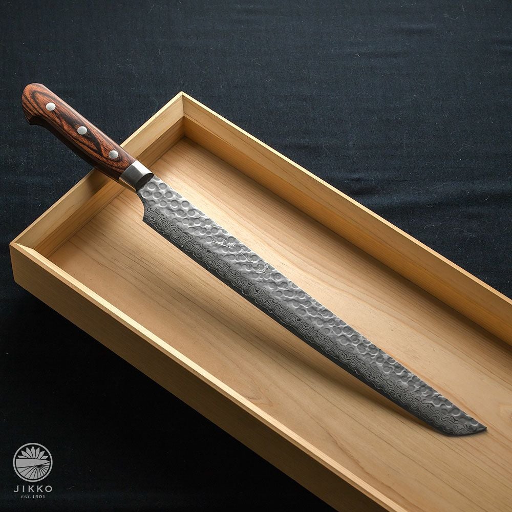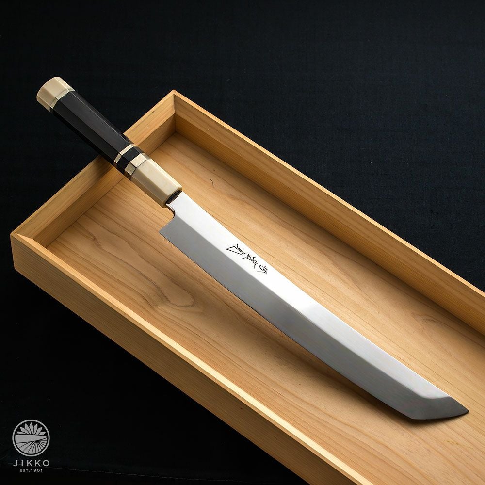 他の画像を見る 【刀心 本焼】先丸刺身包丁 銀3 本焼 鏡面 先丸 当店価格 ¥ 355,630 税込 +詳しく見る 日本刀のような見た目のデザインが人気です。サビにくく切れ味が良い銀三を使用しています。サビにくい包丁をお探しの方にお勧めです。 詳細を見る お気に入りに登録する